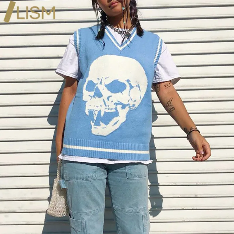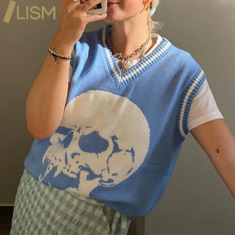 Жилет LISM с принтом черепов, Женский Повседневный свитер без рукавов, вязаные женские пуловеры с V-образным вырезом из акрила на весну и осень, свитера