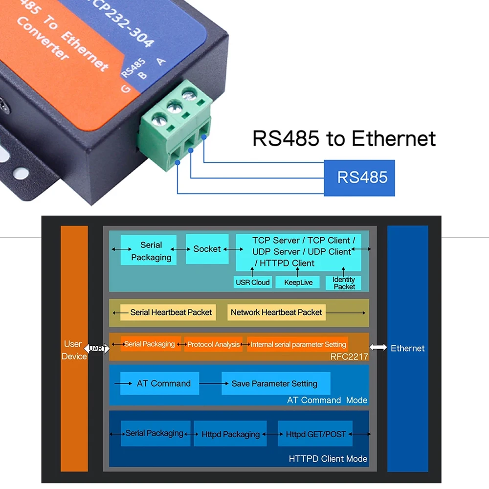 1-портовый RS485 к преобразователь Ethernet USR-TCP232-304 может передавать данные прозрачно между TCP/IP отпечатков пальцев и RS485. RS485 преобразователь Ethernet USR-TCP232-304 широко используются для промышленной автоматизации. Простая конфигурация и простота в использовании.
