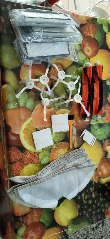 2 х роликовая щетка4 x HEPA-фильтр4 х боковая щетка12 х фильтр для резервуара для воды4 шт. ткань для швабры1 х лезвие1 x крышка основной щетки25 шт.