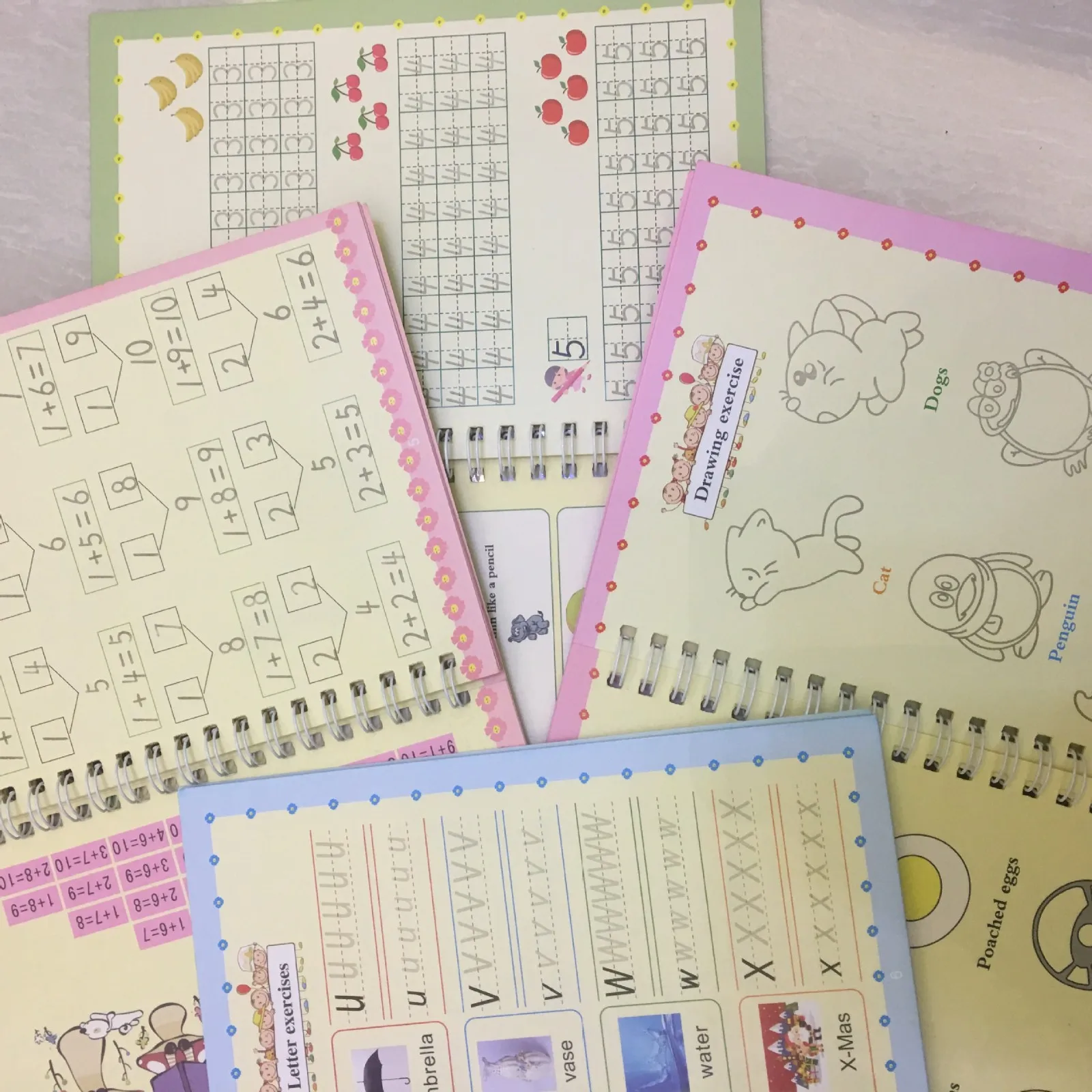 Название: Каллиграфия Почерк и выгодно отличается от обычных однотонных вещей Материал изделия: бумага Включает: 4 x рукописная книжка (1 шт. сложение и вычитание 1 шт. Изображение 1 шт. Алфавит 1 шт. цифры) 1 x Автоматическая ручка для выцветания 1 держатель ручки 5 x заправкиОсобенности: