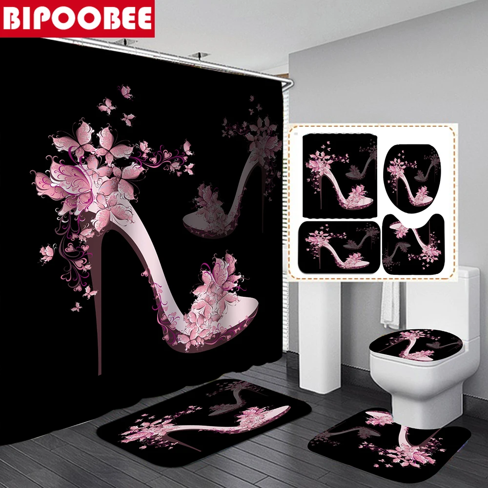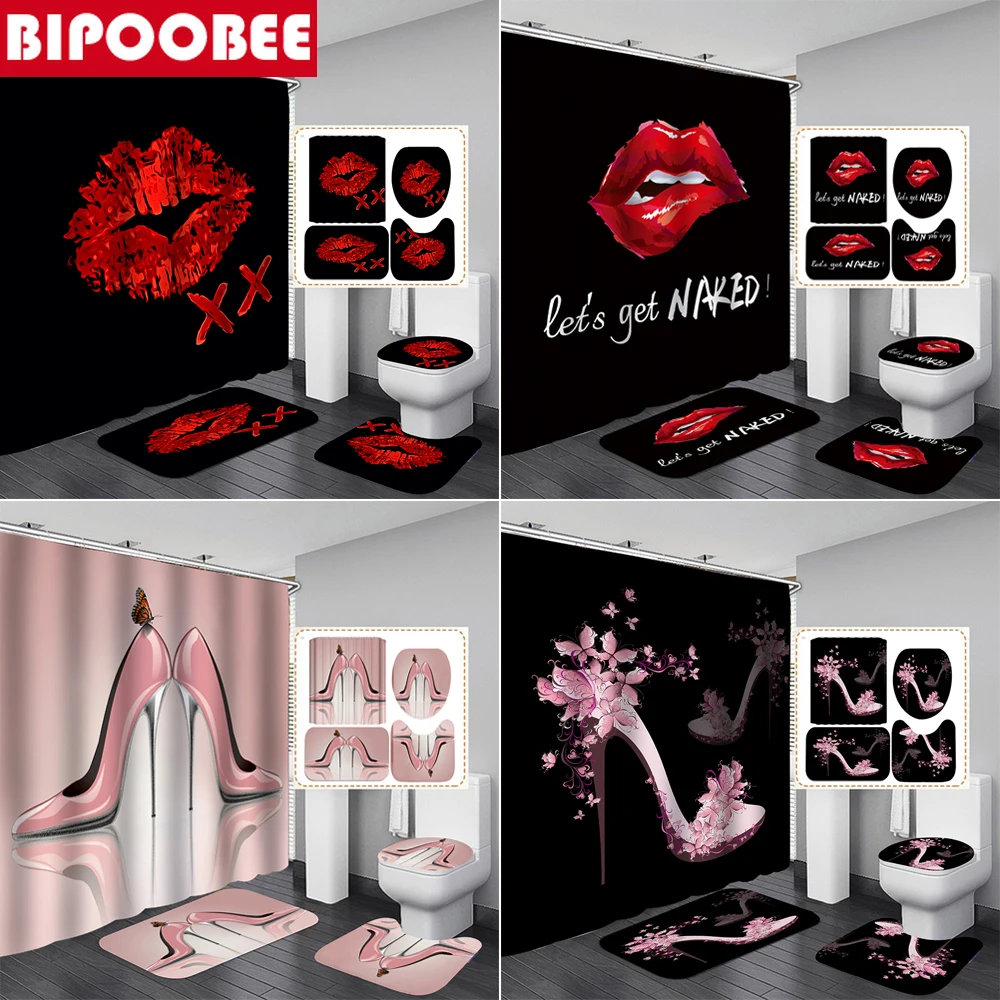 Комплект штор для ванной комнаты с красными губами, розовая занавеска для душа на высоком каблуке Набор ковриков для ванной, с крючками, черная Нескользящая подставка, коврики для туалета крышка