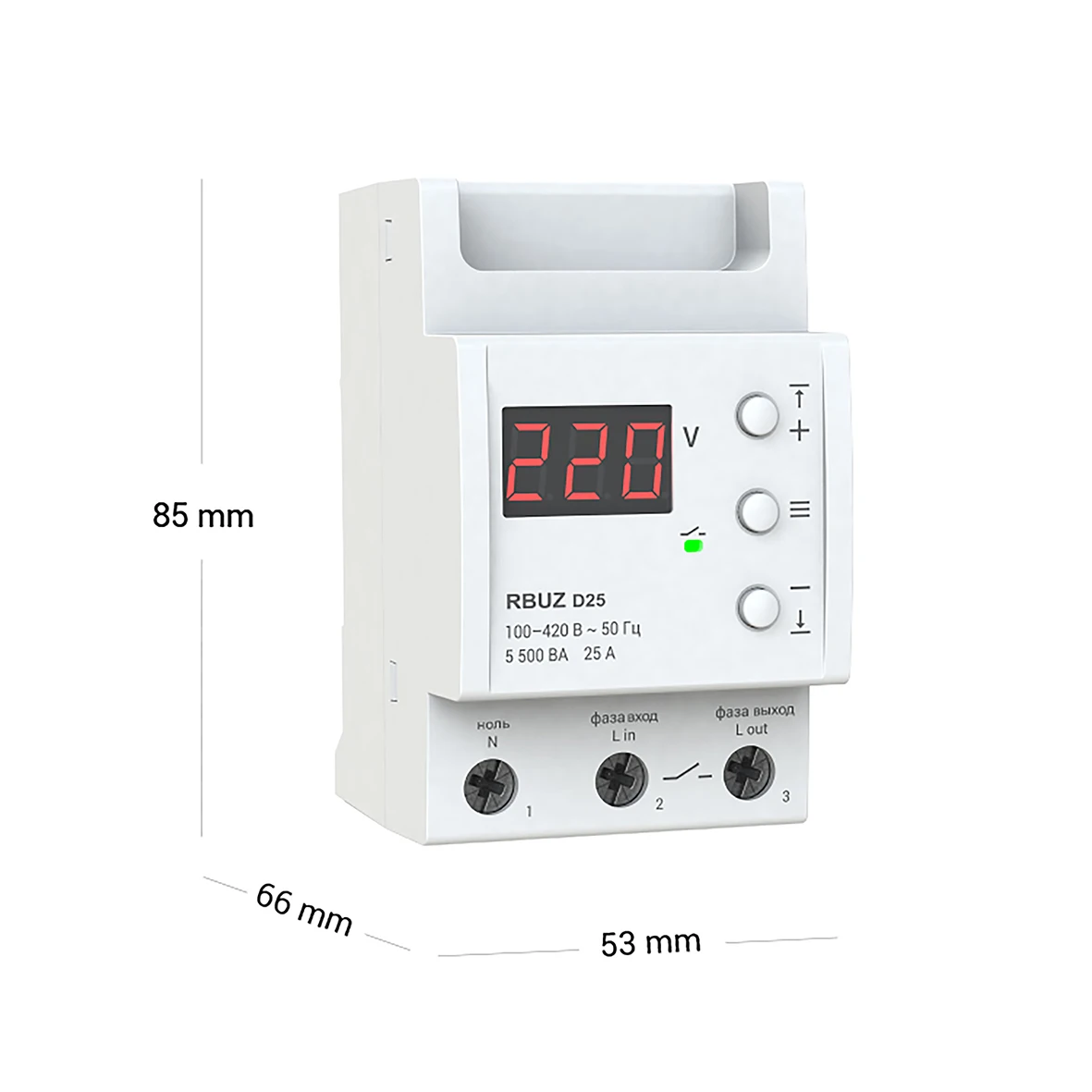 Задержка подачи нагрузкиПосле стабилизации напряжения активируется таймер задержки подачи напряжения. Вы можете настраивать его длительность от 3 до 600 с. Для оборудования, чувствительного к частым отключениям напряжения (например, для холодильников, кондиционеров и тепловых насосов), рекомендованное время задержки составляет 120-180 с.Надежность компонентов и безопасность при эксплуатацииКорпус устройств изготовлен из негорючего поликарбоната. Это повышает безопасность при использовании реле. А применение в схемотехнике немецких конденсаторов EPCOS в 3-4 раза продлевает срок службы по сравнению с аналогами других производителей.Удобная настройкаУправление устройством происходит всего лишь тремя кнопками. Цифровой экран отображает значение напряжения и системную информацию. Он помогает легко установить верхний и нижний предел допустимого напряжения, а также упрощает навигацию в меню.Легкий монтажУстановка реле напряжения осуществляется в распределительный щиток на стандартную DIN-рейку шириной 35 мм. Клеммы устройства обеспечивают надежный контакт в силовой части корпуса.Технические характеристики RBUZ DКатегория продукции:Реле напряженияТок, А:25Способ монтажа:На DIN-рейкуКоличество фаз:1 ф. (230 Вольт)Термозащита:НетTrueRMS:НетПроф. задержка отключения:НетНижний предел напряжения:120-210 ВВерхний предел напряжения:220-280 ВНоминальная мощность нагрузки:5 500 ВАВремя отключения нагрузки при снижении напряжения:не более 1,2 сВремя отключения нагрузки при превышении напряжения:0,01–0,03 сНоминальный ток нагрузки:25 А (макс. 30 А в течение 10 мин.)Время задержки включения нагрузки:3-600 сТип реле:ЭлектромагнитноеНапряжение питания:100-420 ВПотребление тока:не более 86 мАСечение провода:не более 16 мм²Масса:0,21 кг ±10%Габаритные размеры (Ш х В х Г):53 х 85 х 70 ммКоличество коммутаций под нагрузкой, не менее:100 000 цикловКоличество коммутаций без нагрузки, не менее:1 000 000 цикловтепень защиты по ГОСТ 14254:IP20Мощность, ВА:5 001 - 7 000Комплект поставки:реле, гарантийное свидетельство, гарантийный талон, технический паспорт, инструкция, упаковочная коробка