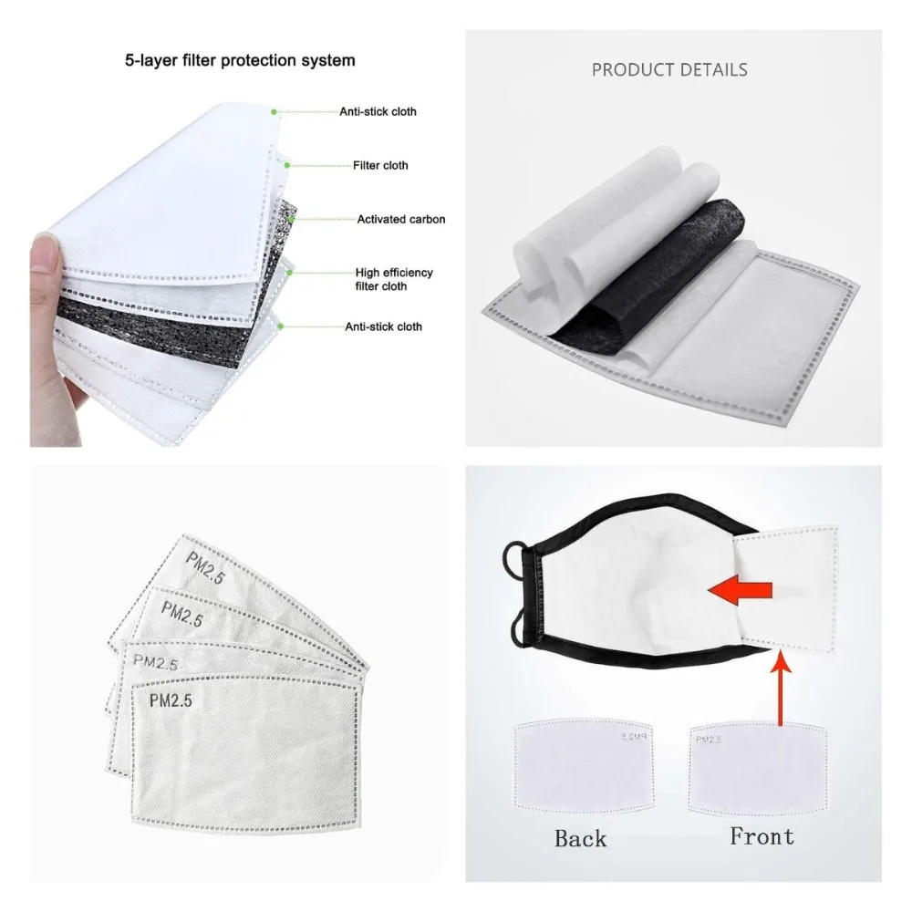 1. С внутренним карманом, который может держать фильтр;5-слойный фильтр из активированного угля;M-образный зажим для носа. (Регулируется)