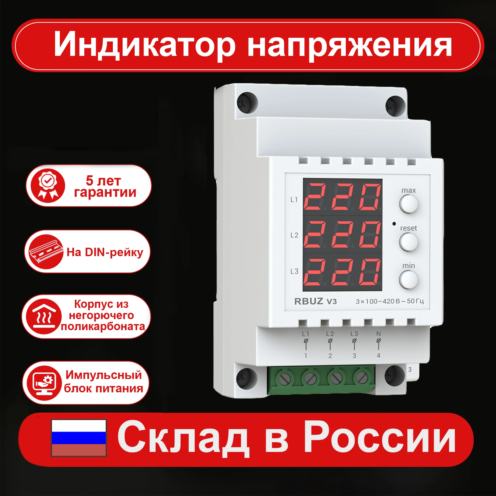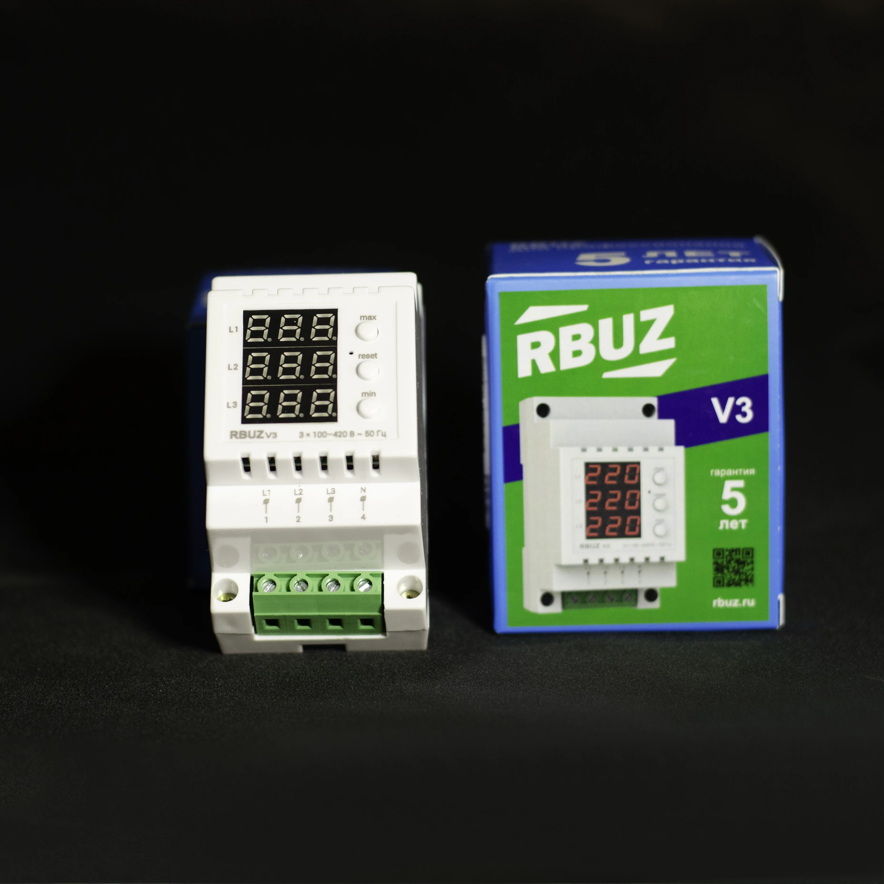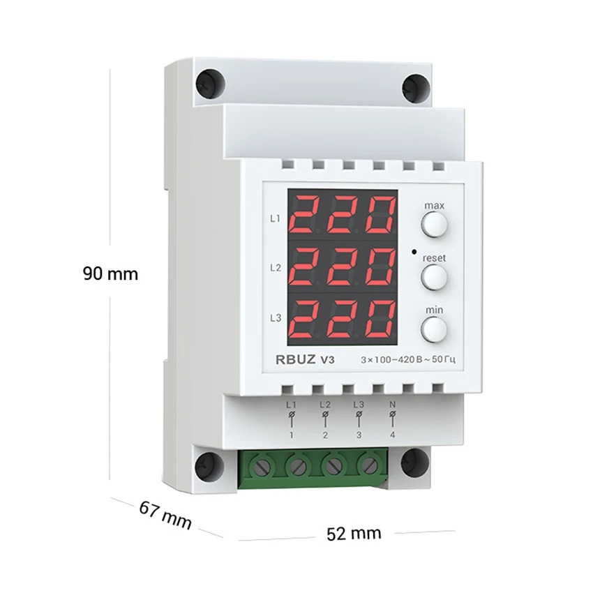 Удобное управление и информативностьУправление вольтметром осуществляется с помощью трех кнопок. Верхняя кнопка позволяет просмотреть максимальное значение напряжения с момента последнего сброса, а нижняя — минимальное. Сброс значений осуществляется с помощью средней кнопки. Вольтметр оснащен энергонезависимой памятью, поэтому выключение питания не приводит к потере данных о критических значениях напряжения.Калибровка отображаемого напряженияВы можете корректировать значение отображаемого напряжения в соответствии с вашим контрольным прибором.Безопасность при эксплуатацииКорпус трехфазного вольтметра изготовлен из негорючего поликарбоната. Этим увеличивается безопасность при использовании устройства.Простой монтажУстановка вольтметра RBUZ V3 осуществляется в распределительный щиток на стандартную DIN-рейку шириной 35 мм. Если в помещении существует вероятность попадания воды на вольтметр, тогда щиток должен соответствовать требованием класса защиты ІР55 согласно ГОСТ 14254.Технические характеристики RBUZ V3Категория продукции:Вольтметры-амперметрыСпособ монтажа:На DIN-рейкуКоличество фаз:3 ф. (230/380 Вольт)Термозащита:НетTrueRMS:ЕстьНапряжение питания:100-420 ВСечение провода:не более 16 мм²Масса:0,14 кг ±10 %Габаритные размеры (Ш х В х Г):52 х 90 х 67 ммСтепень защиты по ГОСТ 14254:IP20Комплект поставки:вольтметр, гарантийное свидетельство, гарантийный талон, технический паспорт, инструкция, упаковочная коробка