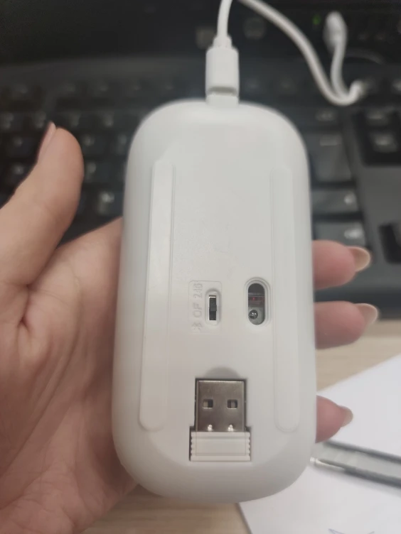 Посылка пришла очень быстро - менее двух недель. Работает в двух режимах. Не очень удобно только, что для инициирования "спаривания" в режиме Bluetooth нужно достаточно долго нажимать три кнопки. Вполне могли бы сделать при включении режима Bluetooth переключателем. Чехарда в версии Bluetooth - в описании на сайте 4.0, в инструкции 4.2 (весьма бестолковой как водится), а ноутбук показывает 3.0. Работает на всех поверхностях, возможно источник - лазер. Мышь полностью белая, поэтому красиво светятся внутри светодиоды - красные, синие и зеленые (в разных режимах).