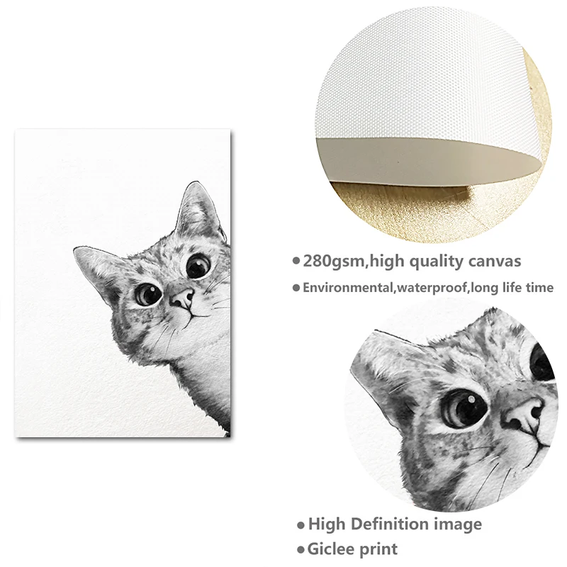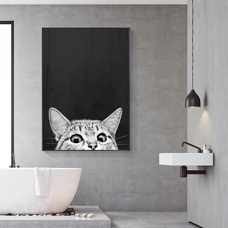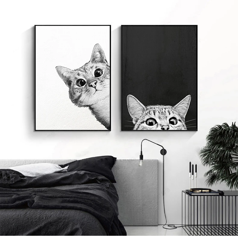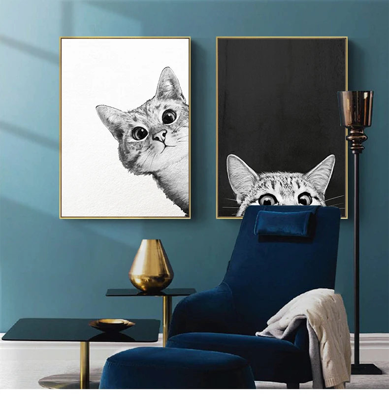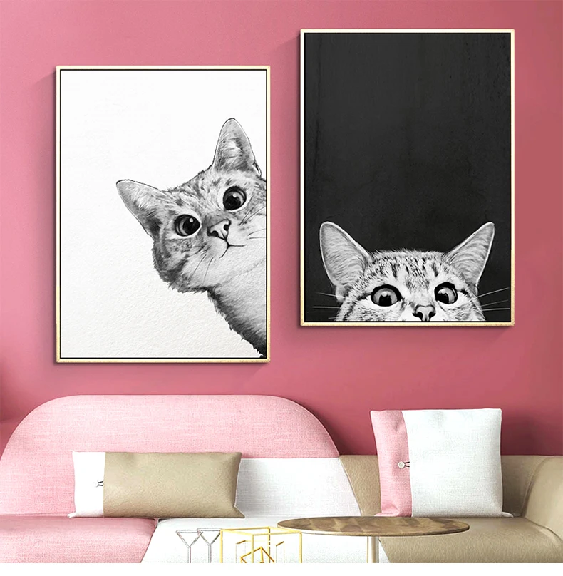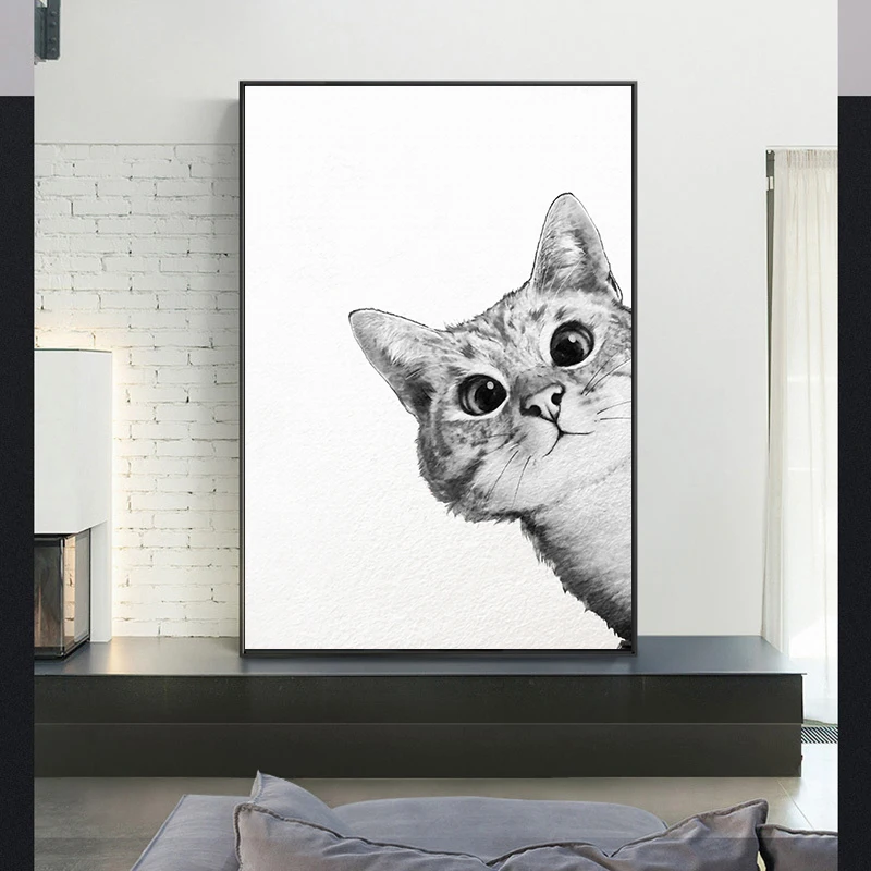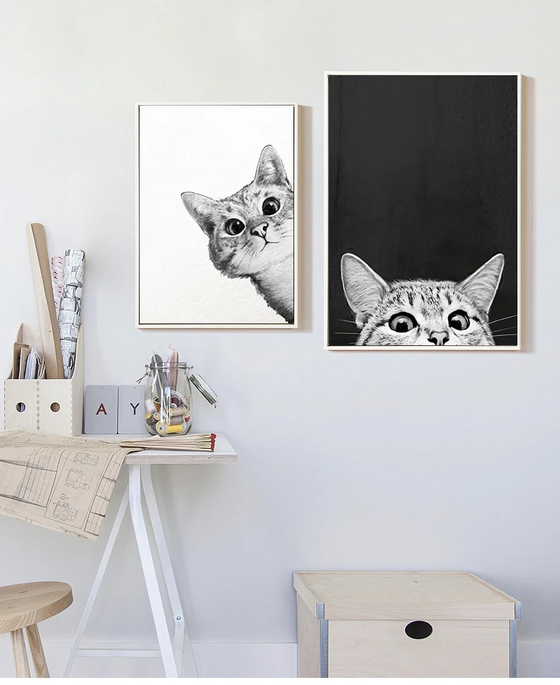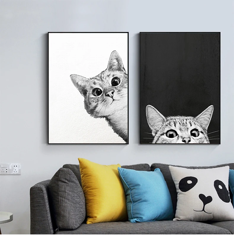 Простые плакаты в скандинавском стиле с рисунком мультяшного кота, картины на холсте, настенное художественное черно-белое изображение для детской комнаты, украшение для дома