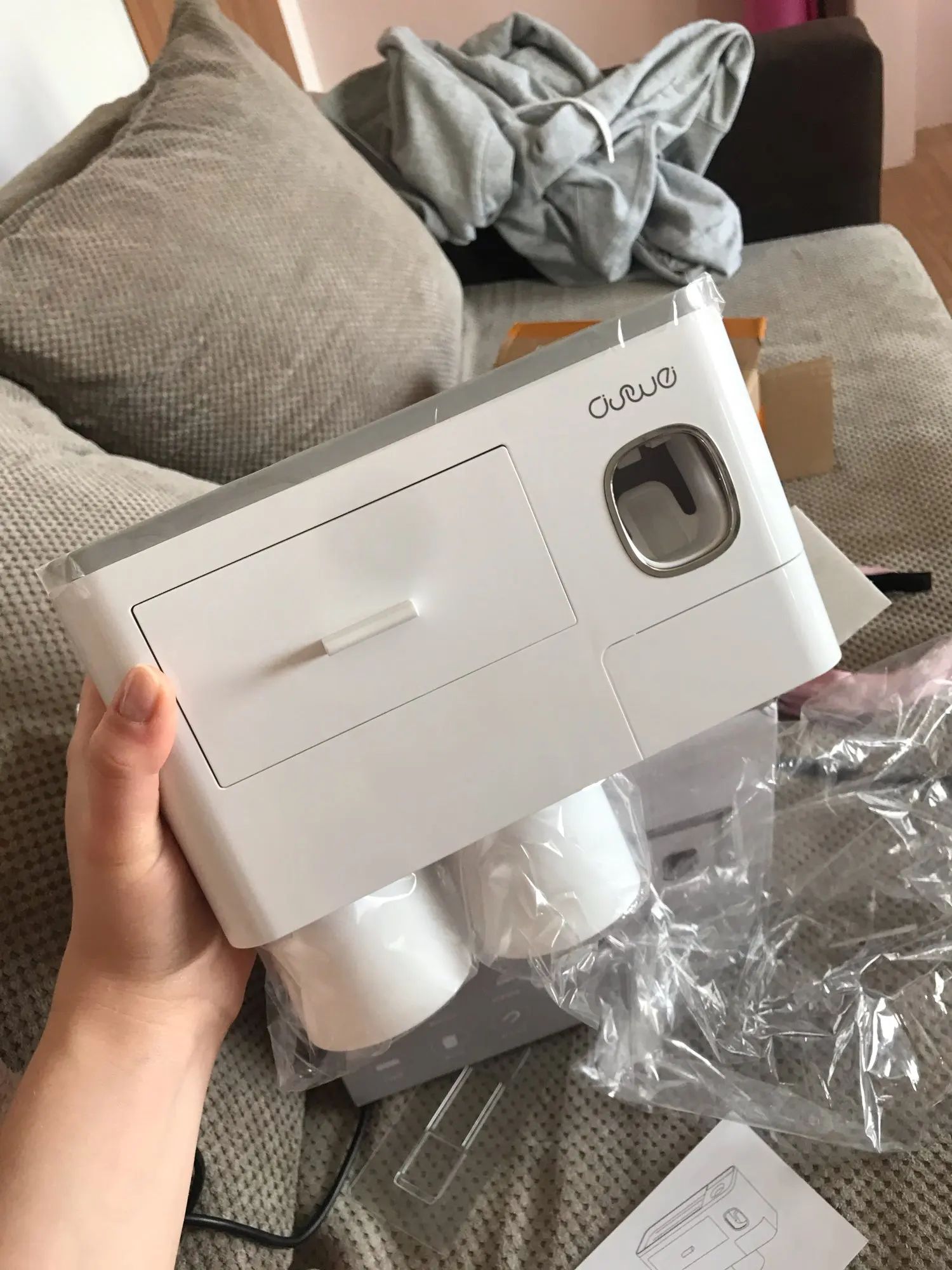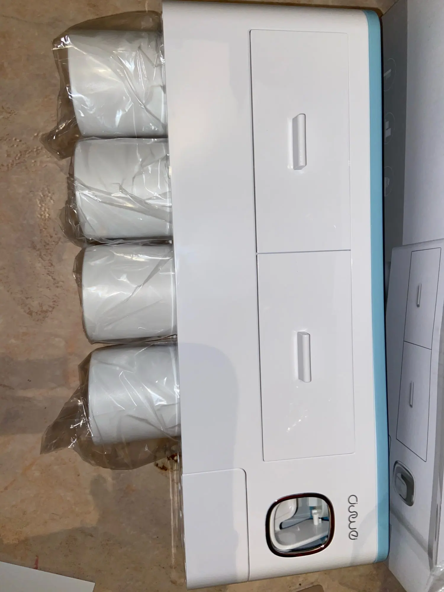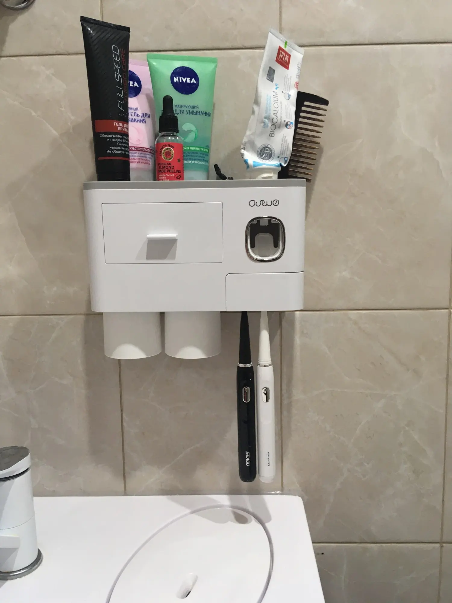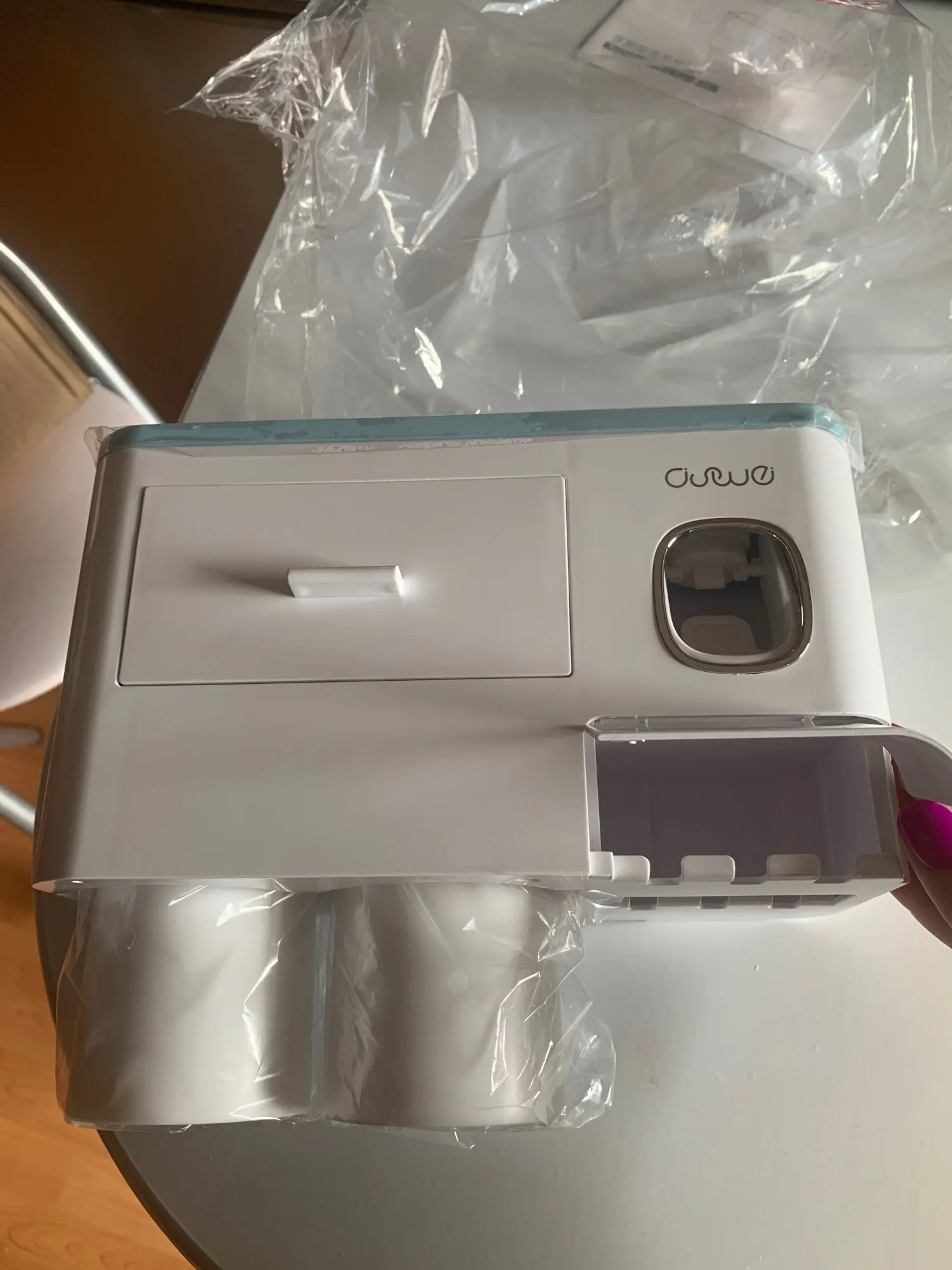 диспансер не автоматический, там нажать щёткой нужно. но в целом очень классная штука! очень удобно и вся мелочь помещается. брала с 4мя стаканчиками и 2 маленькими ящиками. супер! доставка на 3й день была курьером до квартиры