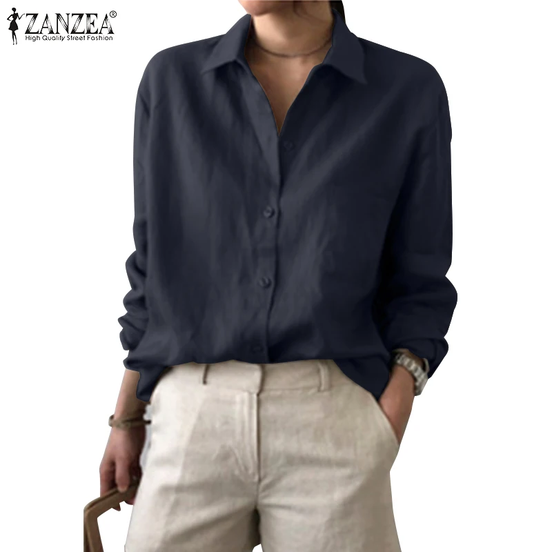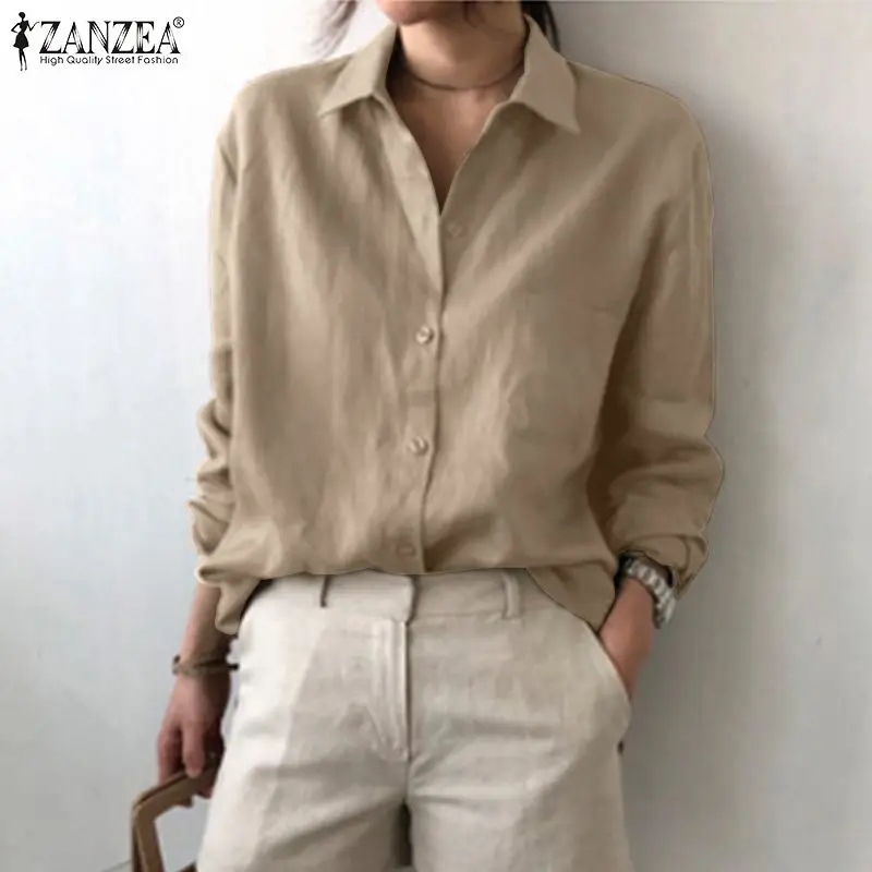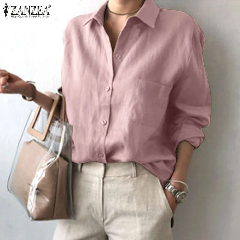 Элегантные однотонные рубашки, Женская Весенняя блузка ZANZEA 2021, повседневные блузы с длинным рукавом, Женская туника с лацканами, топы на пуговицах, рубашка