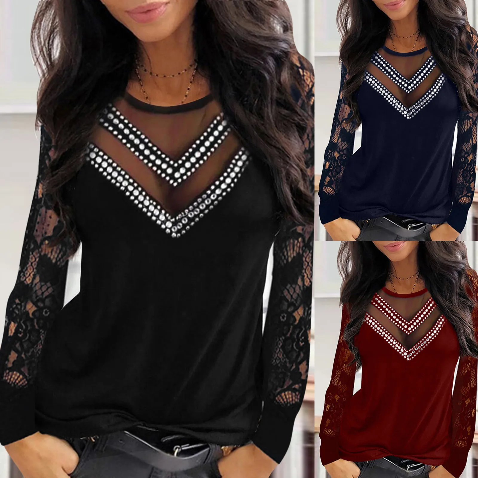 Модная кружевная сетчатая блузка со стразами, женская рубашка с V-о...