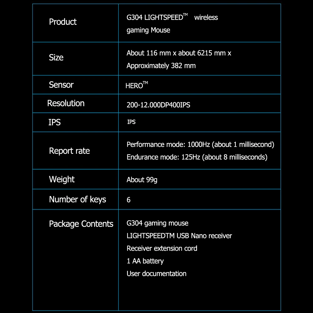 Logitech G304 LIGHTSPEED игровая мышь HERO сенсор 12000DPI Регулируемая 6 программируемых кнопок беспроводная мышьОсобенность:Датчик героя:HERO-это революционный новый оптический датчик, разработанный Logitech G, обеспечивающий лучшую производительность в 10 раз больше энергоэффективности (по сравнению с предыдущим поколением). Датчик HERO обеспечивает исключительно точную и стабильную производительность с нулевым сглаживанием, фильтрацией или ускорением от 200 до 12000 DPI. G304 может сохранять до 5 профилей с уровнем до 5 DPI каждый на встроенной памяти.Световой беспроводной:Благодаря комплексному проектированию и дизайну компания Logitech G разработала надежное беспроводное решение для решения фундаментальных проблем задержки, стабильности и подключения. Конечным результатом является LIGHTSPEED, профессиональное беспроводное решение, которое обеспечивает проводную производительность.Сверхдлительный Срок службы батареи:Датчик HERO и Беспроводная связь LIGHTSPEED обеспечивают чрезвычайную эффективность, позволяя играть месяцами. Работает до 250 часов на одном аккумуляторе AA. Его можно отрегулировать до 9 месяцев обычного использования в режиме выносливости, который можно выбрать с помощью Logitech G HUB.3 Протестировано на Logitech G240 Gaming Mouse Pad Logitech G HUB, также, как светильник индикатор на G304, уведомят вас, когда останется 15% аккумулятора.Сверхлегкий вес:В Logitech G Беспроводная игровая мышь не должна быть тяжелой. G304 очень светильник, всего 99 граммов, что стало возможным благодаря светильник кой механической конструкции и сверхэффективному использованию батареи.6 программируемых кнопок:Первичные переключатели G304, как левый, так и правый, рассчитаны на 10 миллионов нажатий. G304 также имеет средний щелчок, кнопку DPI и две боковые кнопки, которые можно запрограммировать по вашим предпочтениям с помощью концентратора Logitech G.Механическое натяжение кнопки:Механическое натяжение кнопок разделенными кнопками улучшает согласованность левой и правой основных кнопок мыши и помогает снизить силу, необходимую для щелчка. Это обеспечивает четкую и надежную работу кнопок, от которой вы можете зависеть даже в самых интенсивных игровых сеансах.Играть в любом месте:Прочная, легкая конструкция с небольшим размером и встроенным USB нано-приемником делают G304 отличным компаньоном в путешествии.Спецификация:Бренд: LogitechМодель: G304Цвет: фиолетовыйТип применения: электронные спортивные игрыМетод работы: оптическийСпособ подключения: беспроводнойКоличество кнопок: 6Направление колеса: двунаправленноеРазмер мыши: 116,6X62,15X38,2 мм/4,59X2,45X1,5 дюймаВес мыши: 99 гТребования:Для Windows 7 или более поздней версииДля MacOS 10,13 или новееДля Chrome OSTMОтслеживание:Датчик: ГеройРазрешение: 200-12000 DPIНулевое сглаживание/Ускорение/фильтрацияМакс. Ускорение: > 40 гМакс. Скорость: > 400 IPSОтзывчивость:Частота беспроводного отчета: 1000 ГцБеспроводная технология: LIGHTSPEED WirelessМикропроцессор: 32-битная ARMДолговечность:Кнопки (левая/правая): выдерживает около 10 миллионов нажатийПодножки из ПТФЭ: срок службы 250 кмПитание отБатарея: 1 батарейка AA (не входит в комплект)Примечание:1. Из-за различий в мониторах и световых эффектах фактический цвет изделия может немного отличаться от цвета, показанного на фотографиях. Спасибо!2. Возможны отклонения в 1-3 мм из-за измерений вручную.