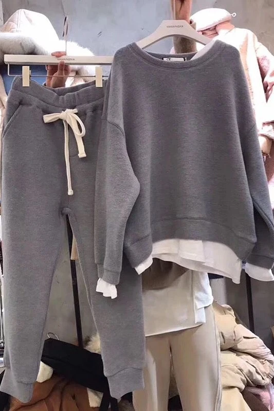 Женский флисовый костюм, однотонная Свободная Толстовка со штанами на завязках, спортивный костюм в Корейском стиле, зима 2021
