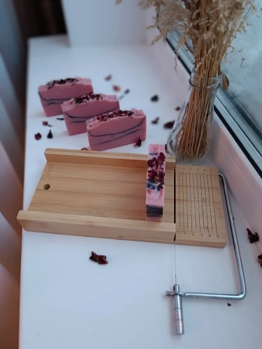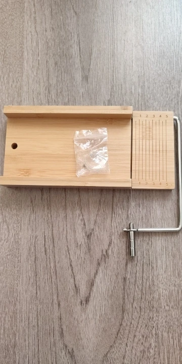 Возможно недостаточно просверлено отверстие для струнной дуги или ещё какая-то причина, но струна от края до края идёт наискосок, с одной стороны цепляя деревянные края изделия. То есть ровно порезать мыло струной не получится.