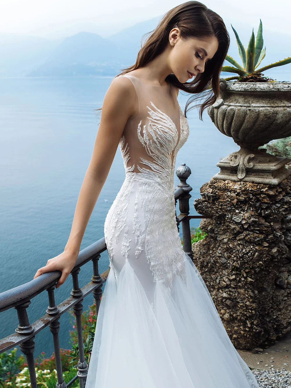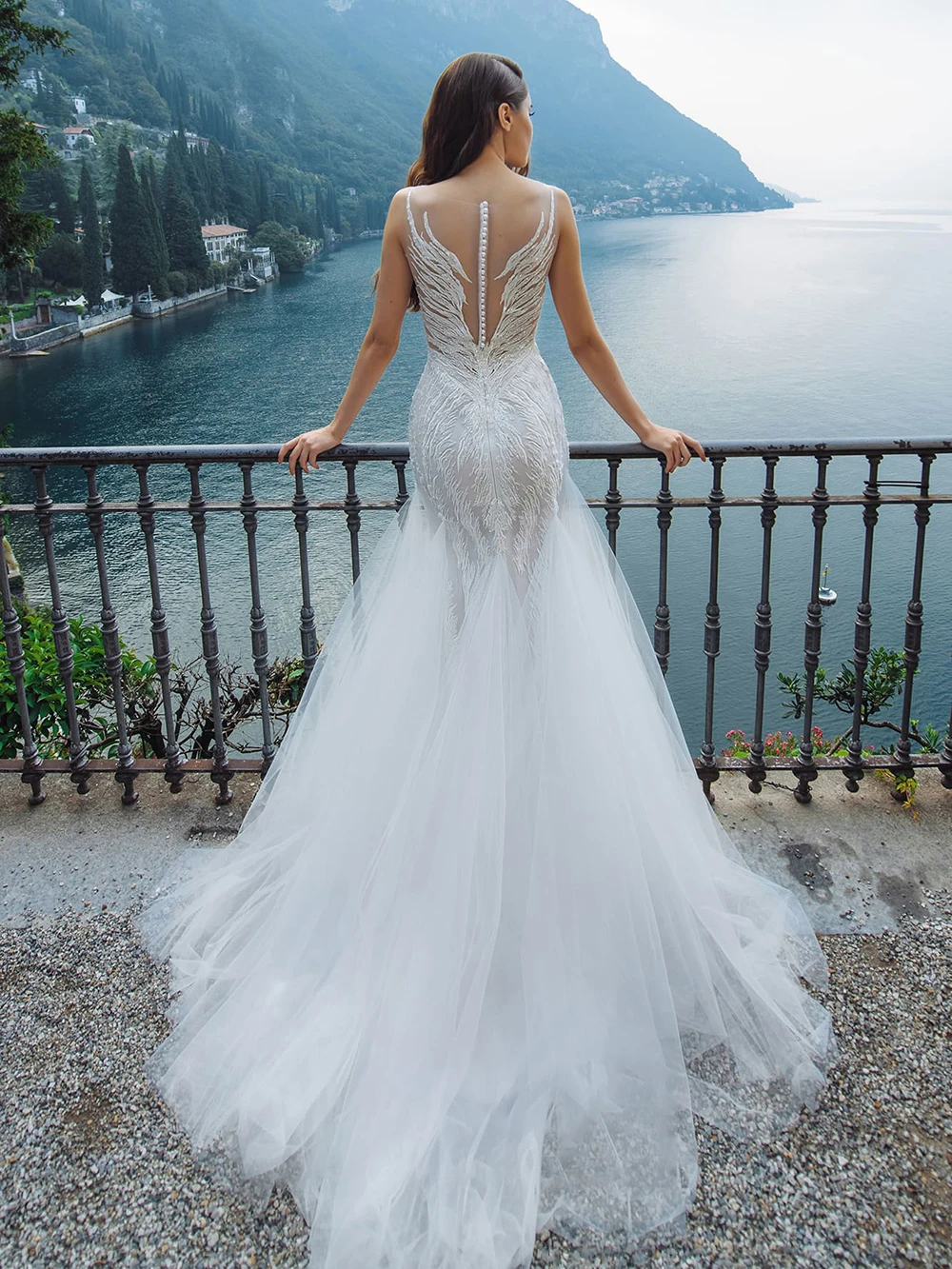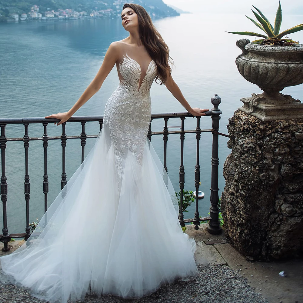 Сексуальные свадебные платья с юбкой-годе, иллюзия, с круглым вырезом, с открытыми плечами, модные, с аппликацией, на пуговицах, длина до пола, 2020, свадебные платья