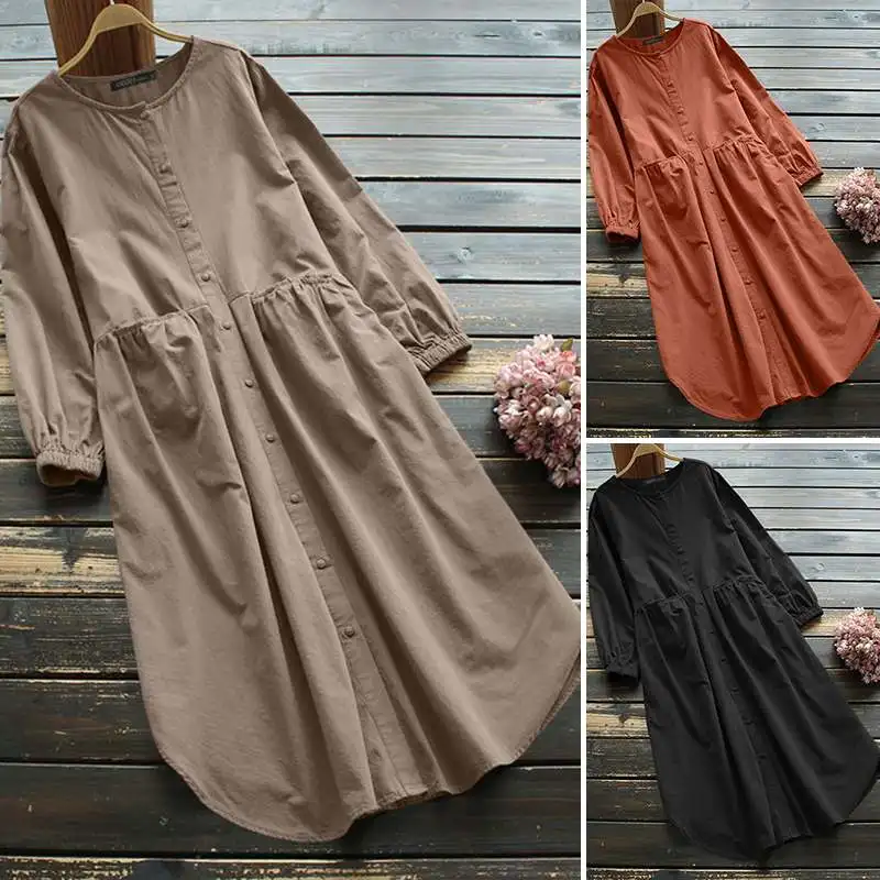 Платье-рубашка ZANZEA женское с длинным рукавом, винтажный однотонн...
