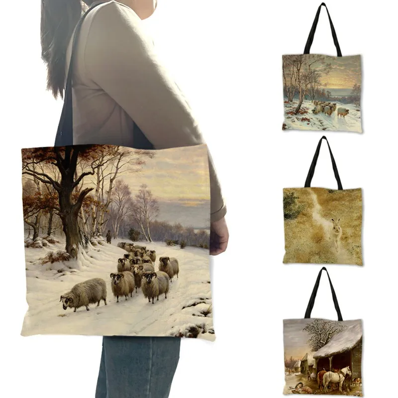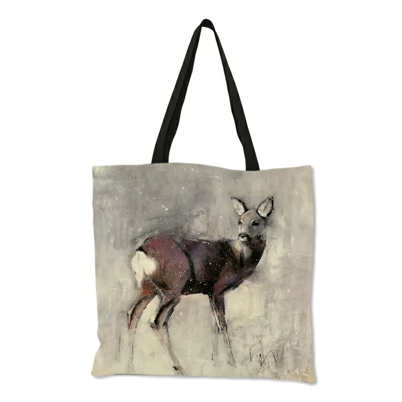 Зимняя большая женская сумка-тоут с рисунком животных в снегу, двусторонняя сумка-шоппер с принтом оленя, кролика, складная многоразовая сумка-шоппер B13169