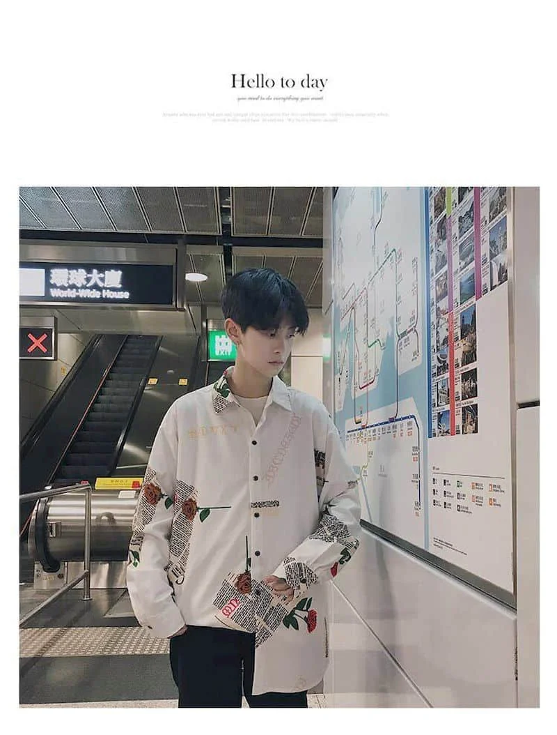 Мужская рубашка с длинным рукавом с принтом газеты и розой, Мужская Студенческая корейская модная Свободная рубашка в гонконгском стиле ретро