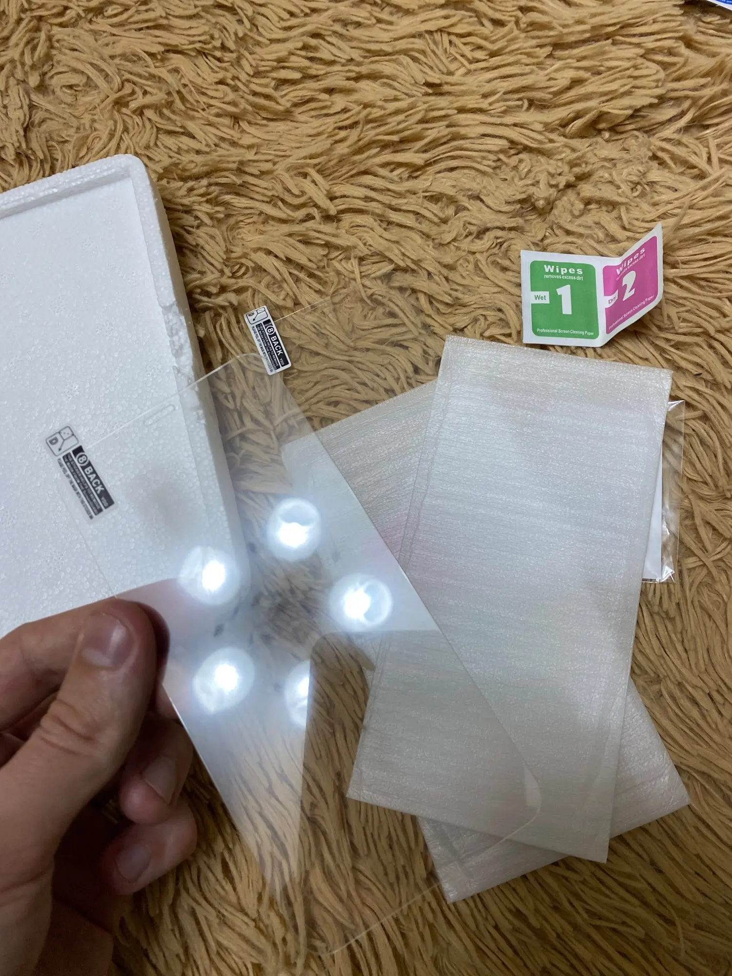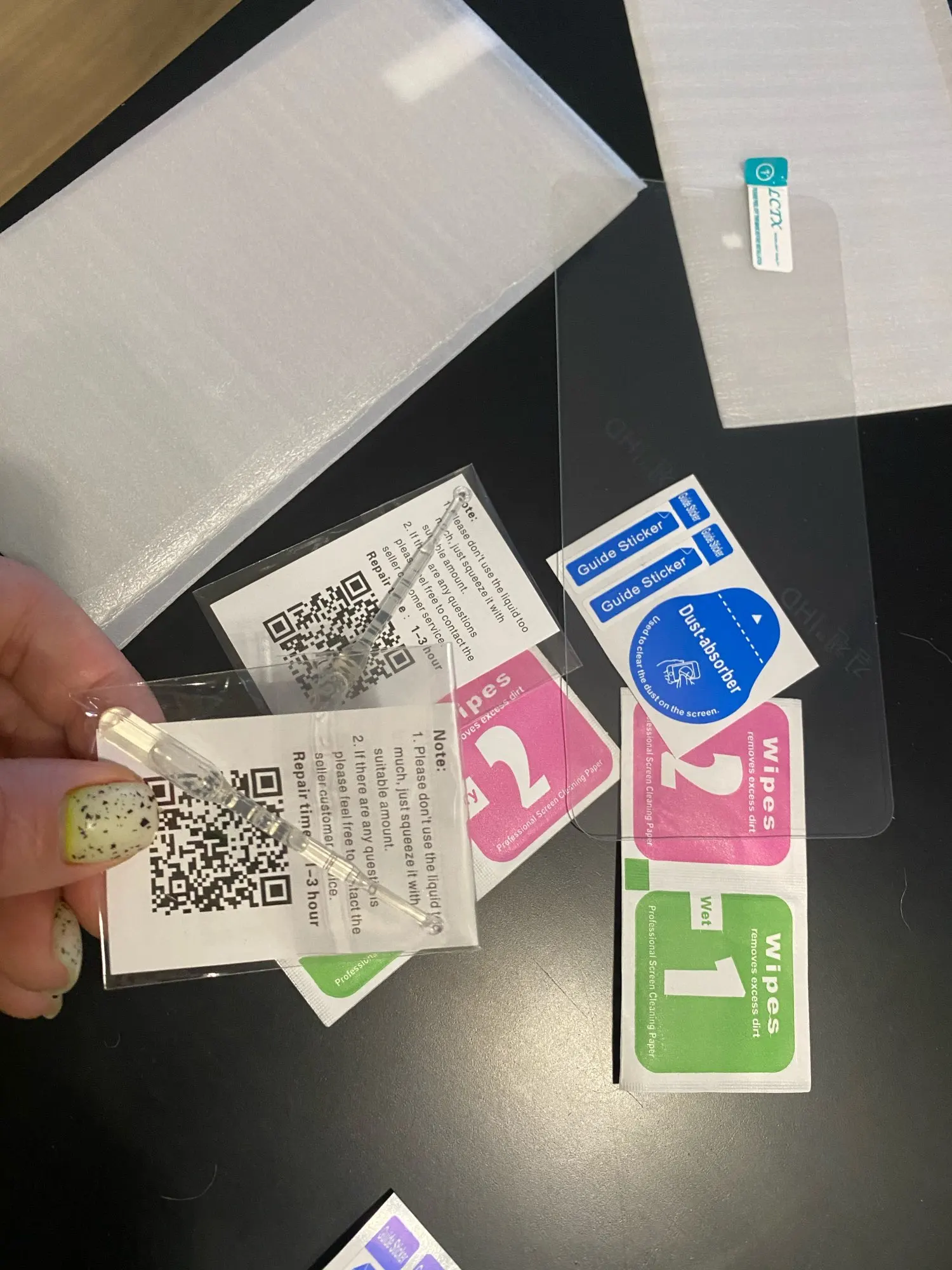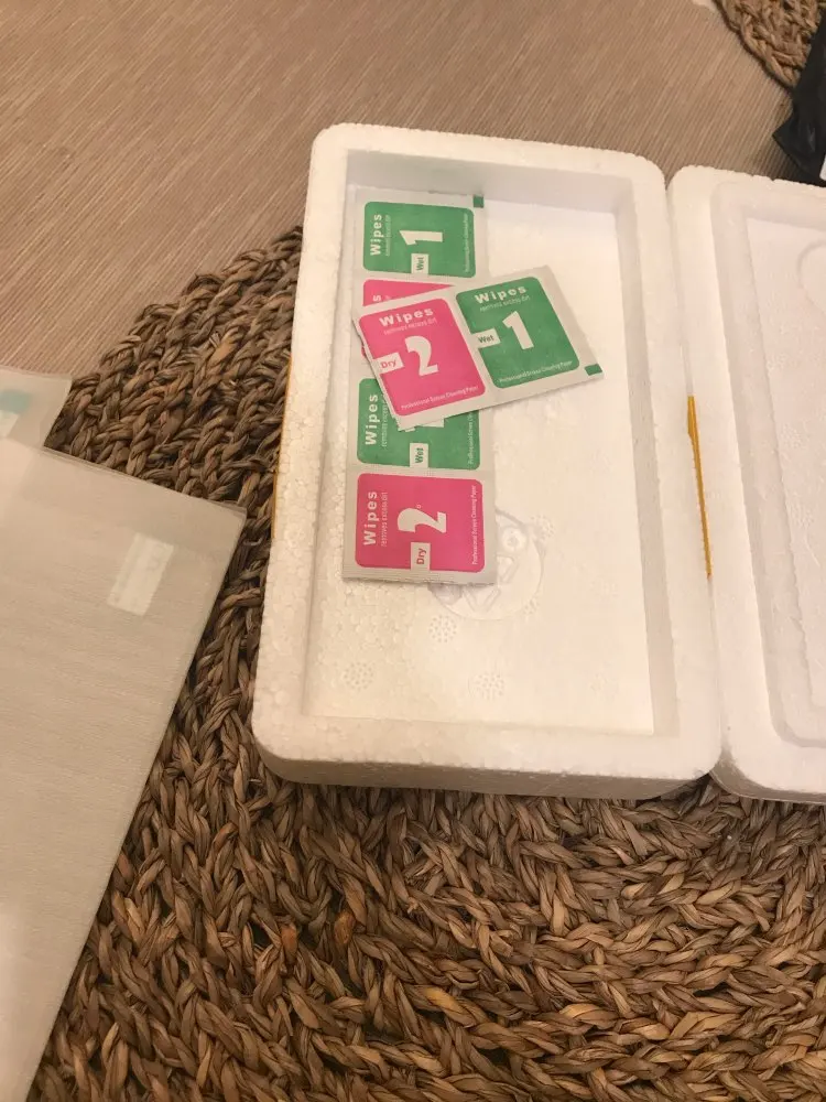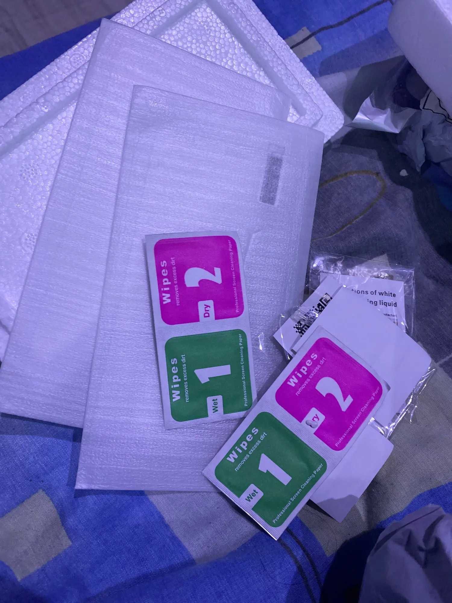 Товар пришёл быстро, в комплекте салфетки, жидкость для удаления воздуха и наклейки для очищения экрана от грязи или пылинок. Стекло хорошее, рекомендую