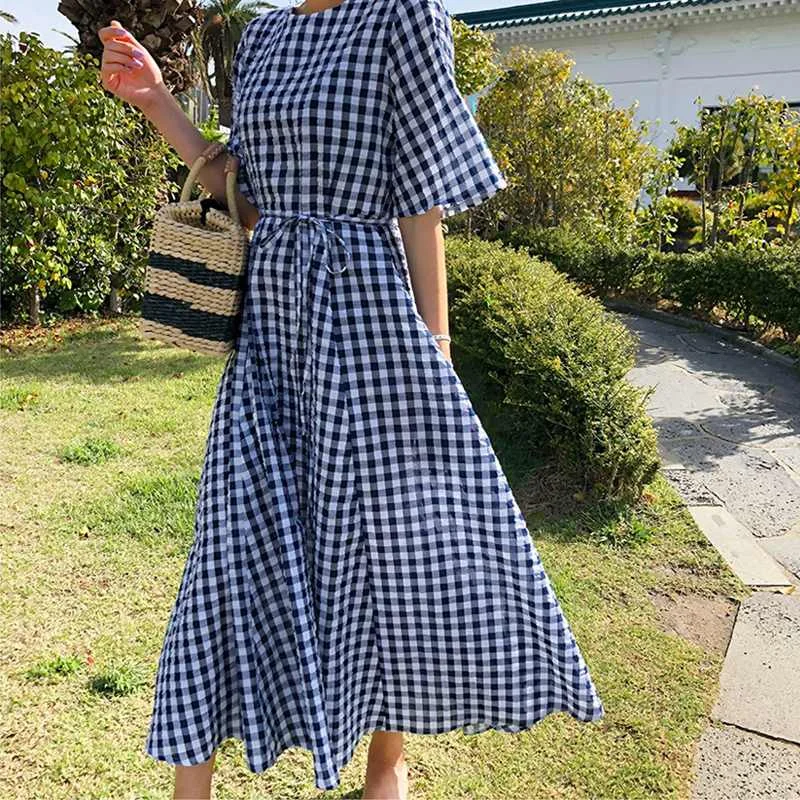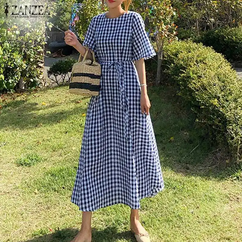 Женский сарафан в клетку ZANZEA 2022, Элегантное летнее платье с круглым вырезом и коротким рукавом, женские повседневные платья до середины икры
