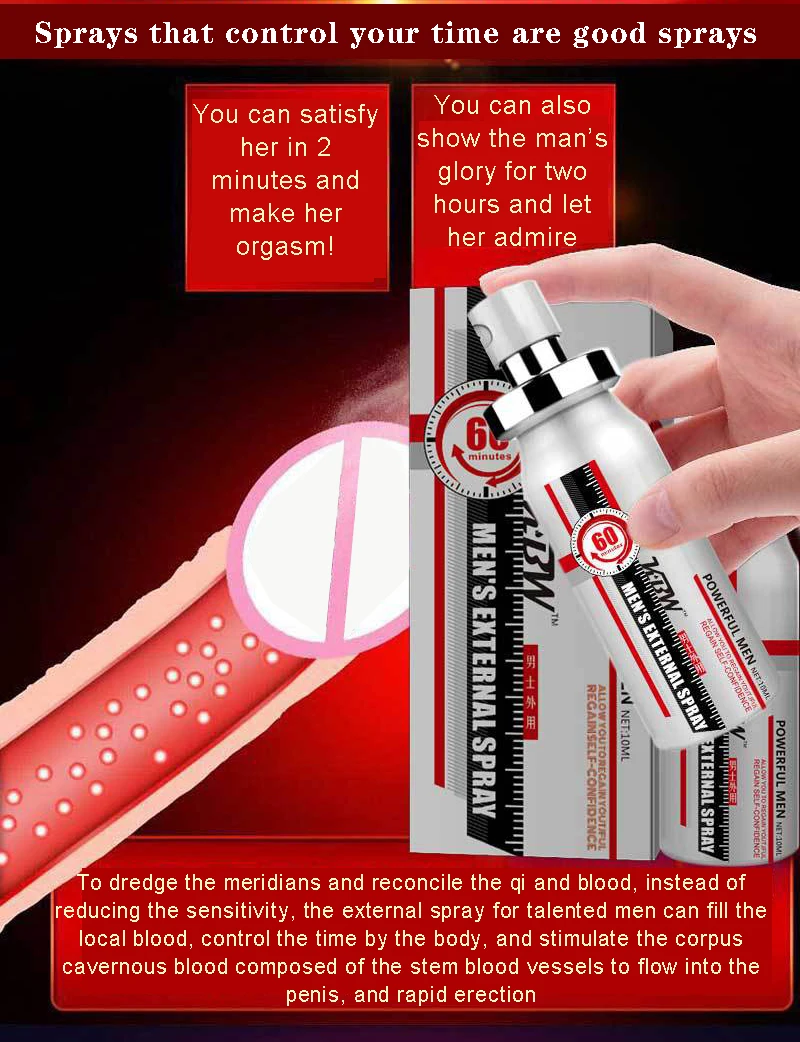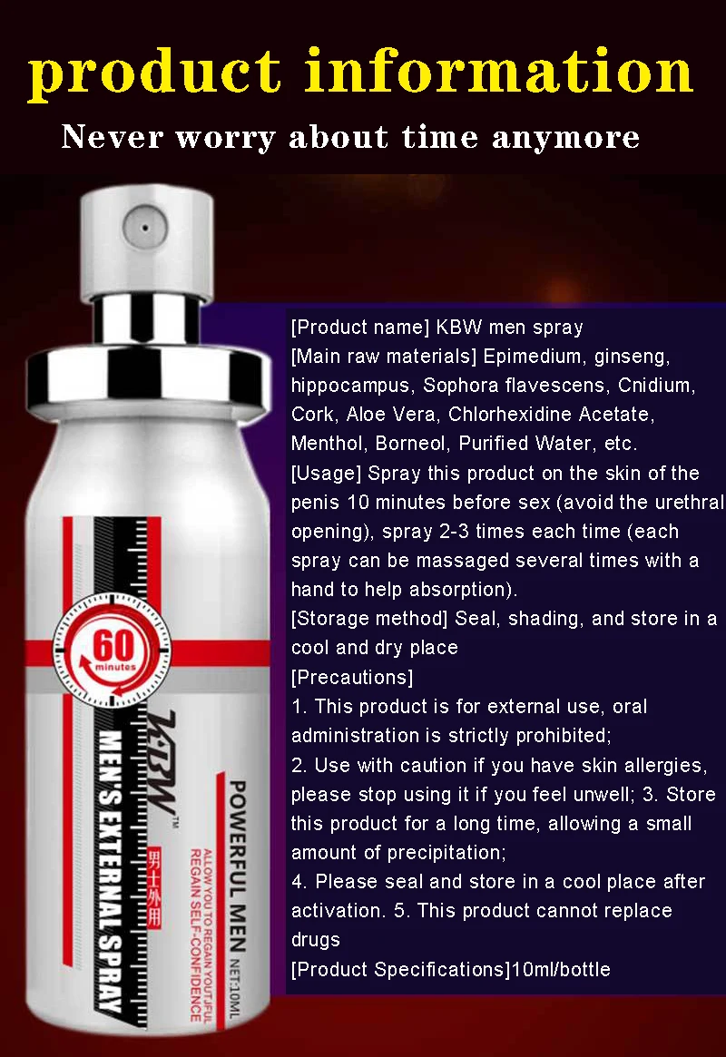 2. Пожалуйста, нанесите этот продукт на Корональные сулькулы мужских гениталий более чем за 30 минут до полового акта, распыляйте 2-4 раза каждый раз и подождите, пока кожа впитывает его; 3. После полового акта, пожалуйста, промойте деталь теплой водой.