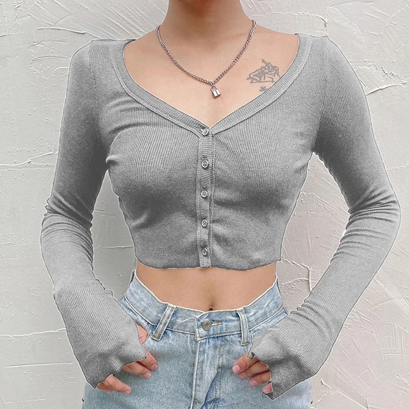 Кроп-топ женский с длинным рукавом, базовый пикантный однотонный черный белый топ с глубоким V-образным вырезом, Повседневная пикантная футболка, лето-осень
