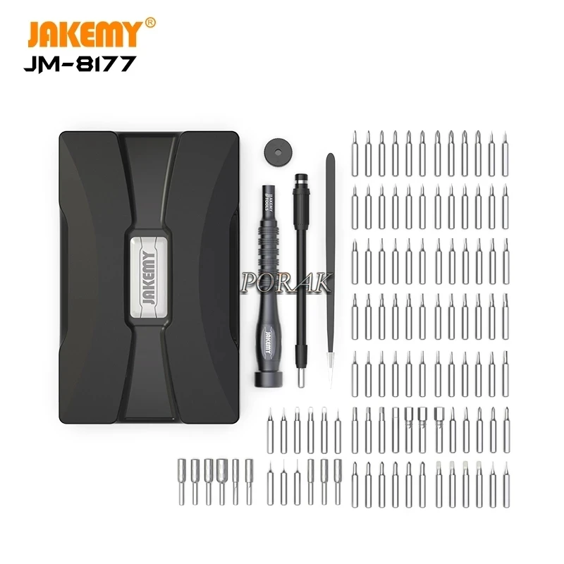 Набор прецизионных отверток JAKEMY из алюминиевого сплава, отвертки с ручкой, магнитные биты для водителя, мобильный телефон, инструменты для ремонта дома Характеристика: -- Бренд: JAKEMY -- Модель: JM-8177 -- Материал бит: CR-V -Характеристики: с мягким удлинителем/пинцетом/мини-магнетизатором Модель бит: -- Hex : H0.7 H0.9 H1.3 H1.5 H2.0 H2.5 H3.0 H3.5 H4.0 H4.5 H5.0 H6.0 -- Torx : T1 T2 * 2 T3 * 2 T4 * 2 T5 * 2 T6 T7 T8 T9 T10 T15 T20 -- Прорези: 1,0*2 1,3*2 1,5*2 2,0*2 2,5*2 3,0*2 3,5*2 4,0 -- Сверление: T6H T7H T8H T9H T10H T15H T20H -- Phillips: 1,0*2 1,5*2 2,0*2 2,5*2 4,0*2 -- Три крыла: Y0.8 * 2 Y2.0 * 2 Y2.5 * 2 Y3.0 -- Pozidrive : PZ1.0 PZ2.0 PZ3.0 PZ4.0 -Pentalobe: 0,8*2 1,2*2 1,5*2 2,0 -Треугольник: 2,0 2,3 2,6 3,0 -- U-образный: U2.6 * 2 U3.0 * 2 -- Квадрат: SQ0 SQ1 SQ2 -- SIM эжектор: 0,8 1,0 -- Противостояние: 1,5*2 -- 4*28 мм гнездо, никелированная CR-V Поверхность: -- Розетки: M2.5 M3.0 M3.5 M4.0 M4.5 M5.0 M5.5 G3.8 G4.2 -- Ручка из алюминиевого сплава * 1 -Мягкий удлинитель * 1 -- Пинцет * 1 -- Черное Намагничивающее кольцо * 1 Посылка: 1 * Набор прецизионных отверток