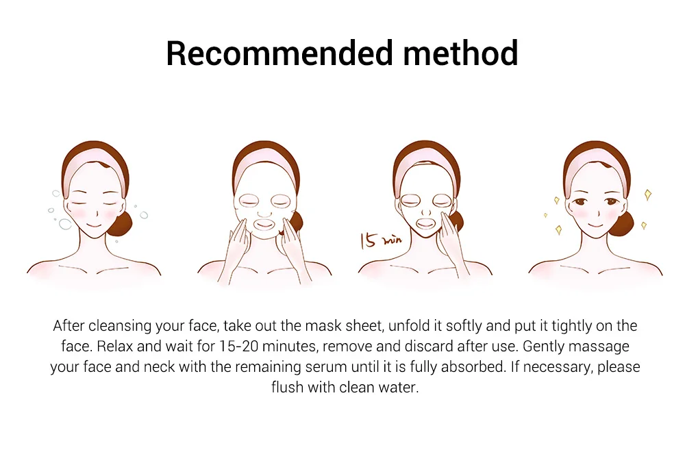 Рекомендуемый метод: 1. После очищения лица выньте лист маски, мягко раскройте его и плотно положите на лицо. 2. Расслабьтесь и подождите 15-20 минут, удалите и удалите после использования. 3. Аккуратно массируйте лицо и шею оставшейся сывороткой до полного впитывания. 4. При необходимости, пожалуйста, промойте чистой водой.
