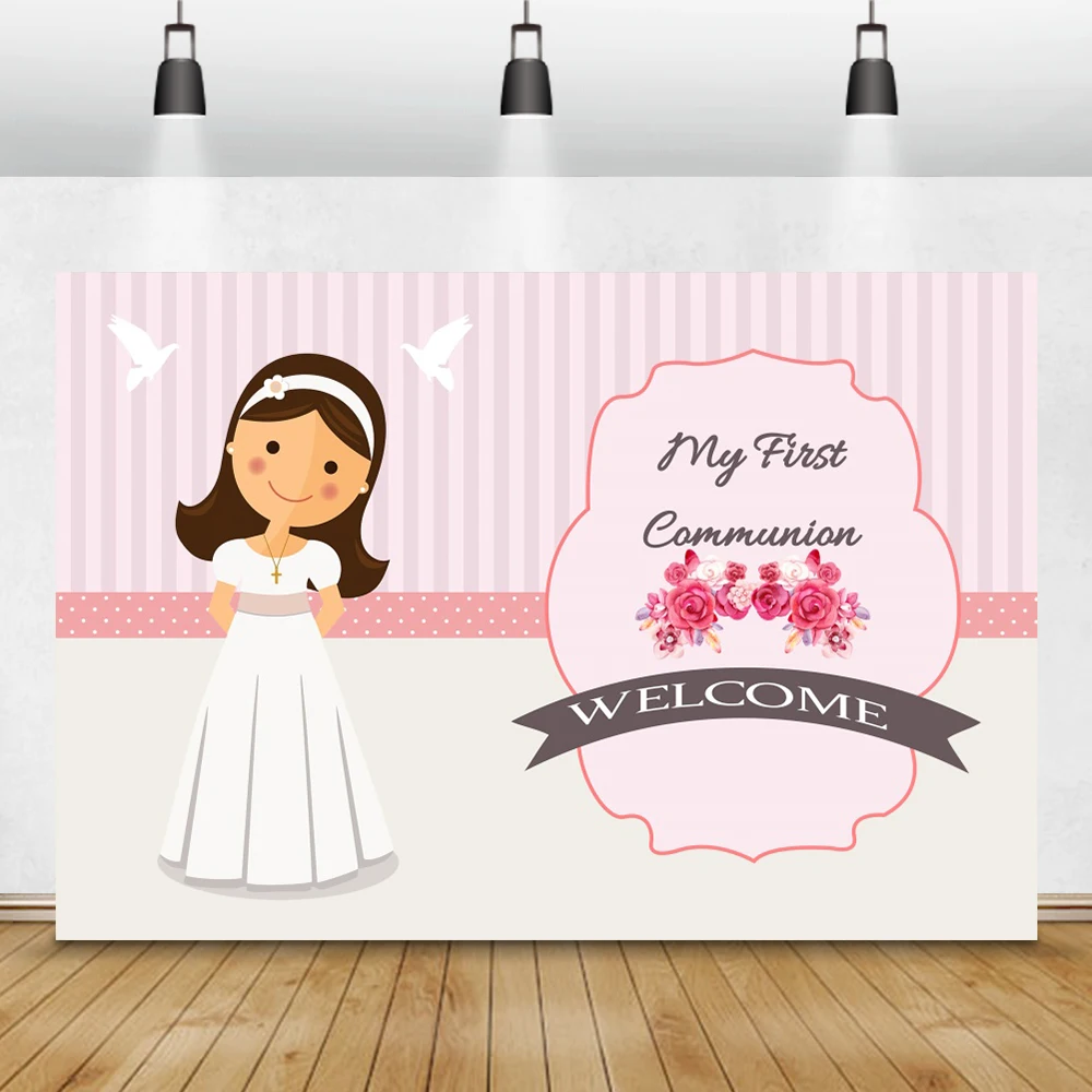 Laeacco мой первый фон для фотосъемки на Причастие розовые полосы цветы для новорожденных девочек фоны для фотосъемки для крещения малышей