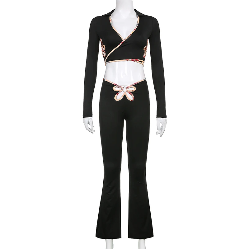 Пикантные женские костюмы с цветочным принтом, комплект из двух предметов, короткий топ и эстетические расклешенные брюки, модный костюм cuteandпсихоз