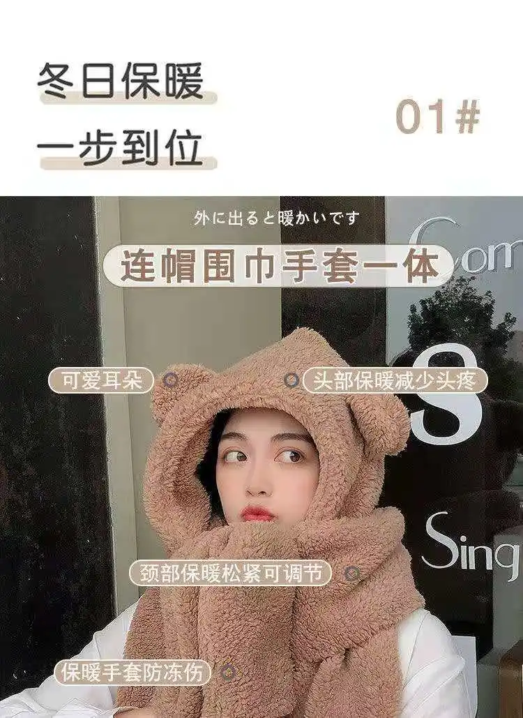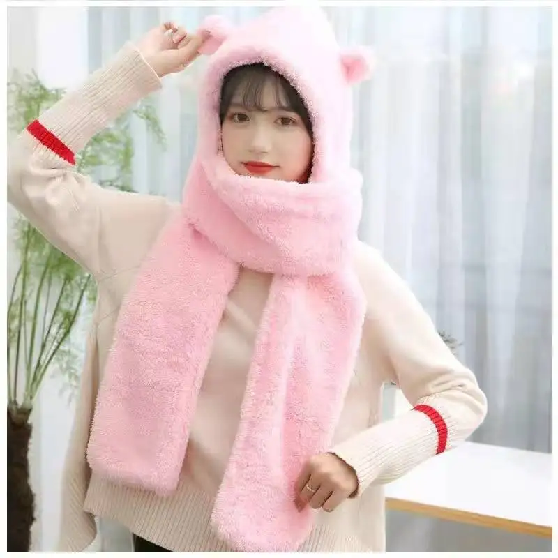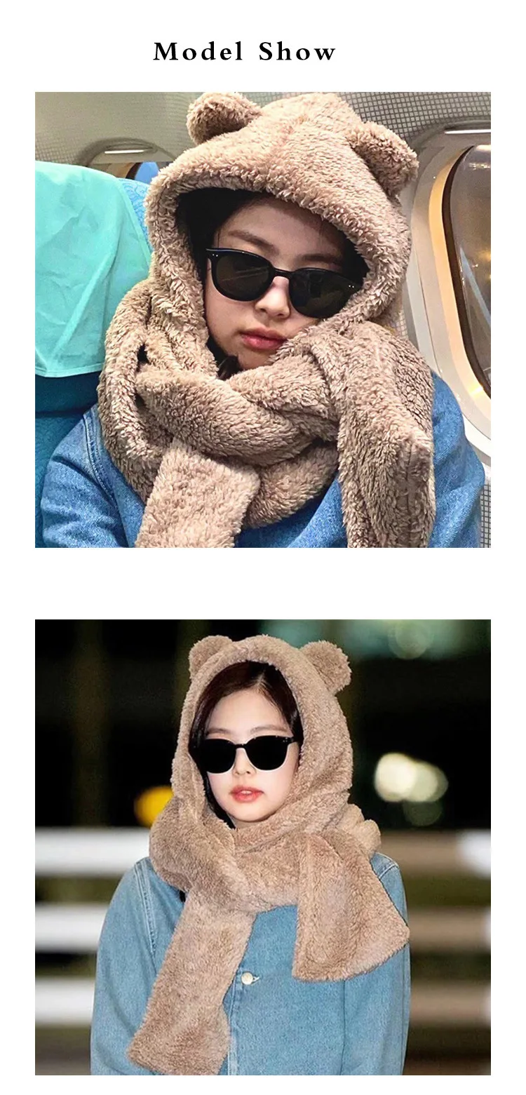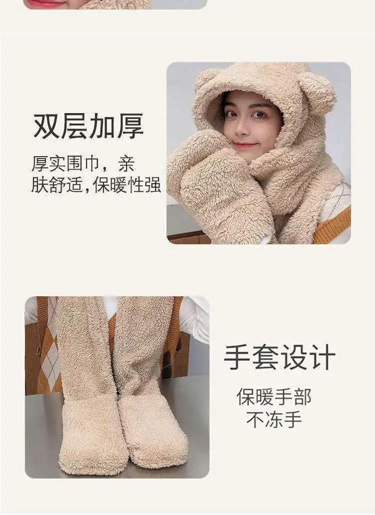 Шапка бини шапка с защитой ушей медведя Женская Осень-зима милый плюшевый нагрудник шарф перчатки с капюшоном Корейская версия универсальные теплые