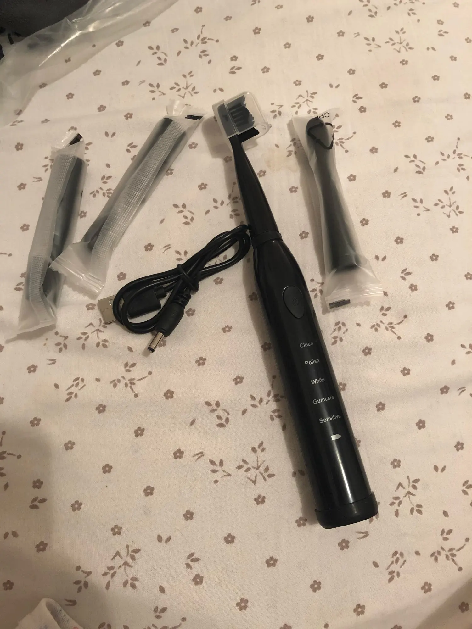 Я очень скоро вернусь, всего за две недели! Электрическая зубная щетка равна фотографиям продавца, она очень элегантная и простая в обращении, восемь головок поставляются в независимых пакетах с зубцами, щетинки довольно мягкие и маленькие и тонкие, чтобы добраться до всех мест во рту, я еще не зарядил их, потому что я нагружен, Я уже использовал его в течение нескольких дней, и он все еще имеет батарею, я рекомендую его спасибо продавцу за скорость
