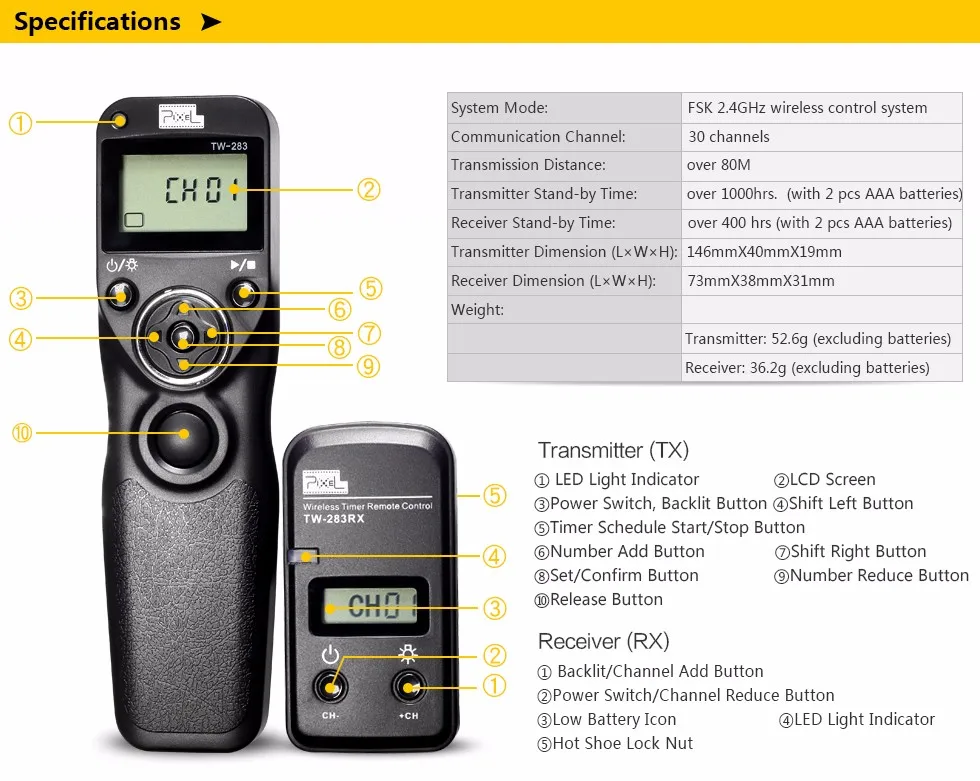 Беспроводной пульт дистанционного управления спуском затвора с таймером Pixel TW-283 (DC0 DC2 N3 E3 S1 S2) кабель для камеры Canon Nikon Sony TW283 VS RC-6