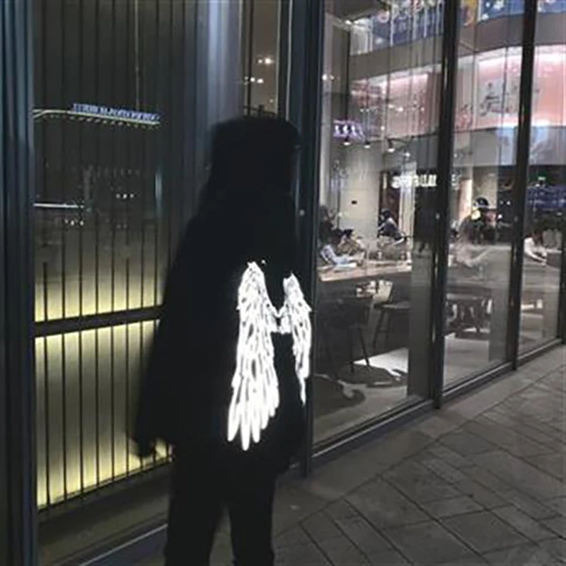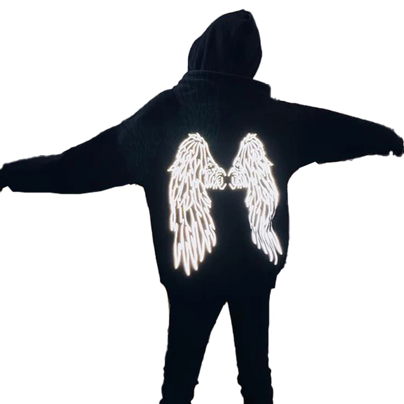 Толстовка с капюшоном для мужчин и женщин, винтажный Повседневный пуловер, Черная Толстовка со светоотражающими крыльями ангела, топы с начесом спереди, зима