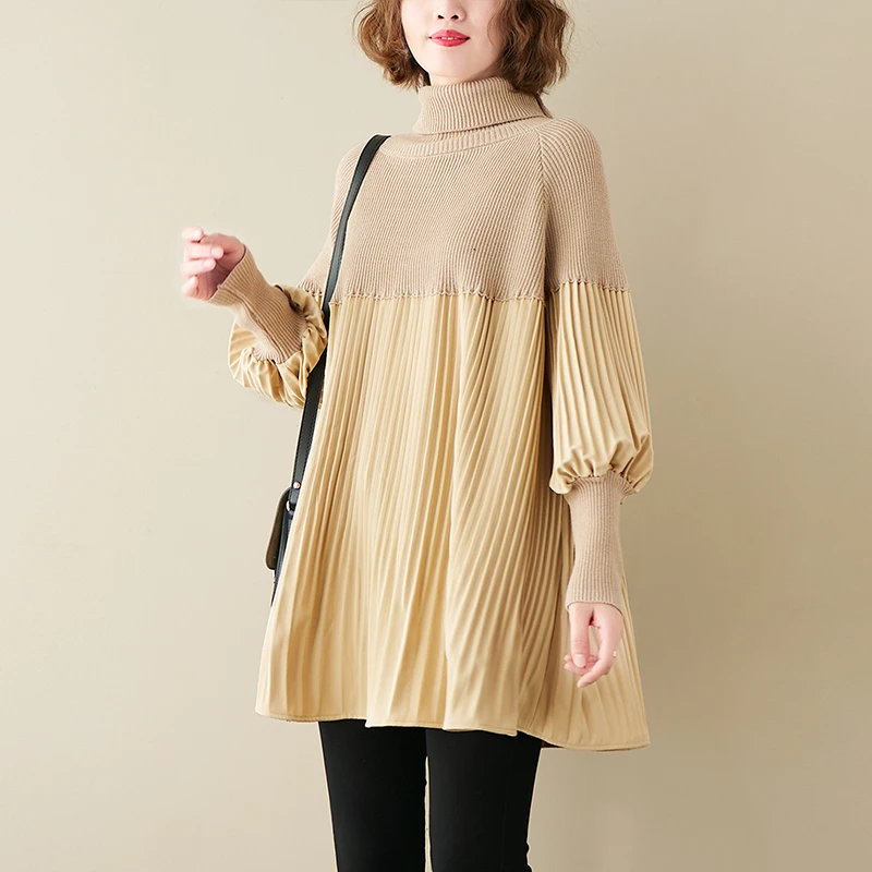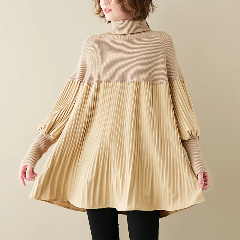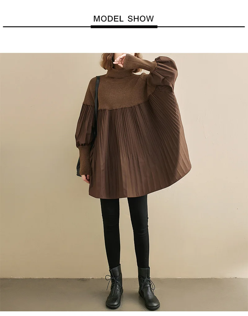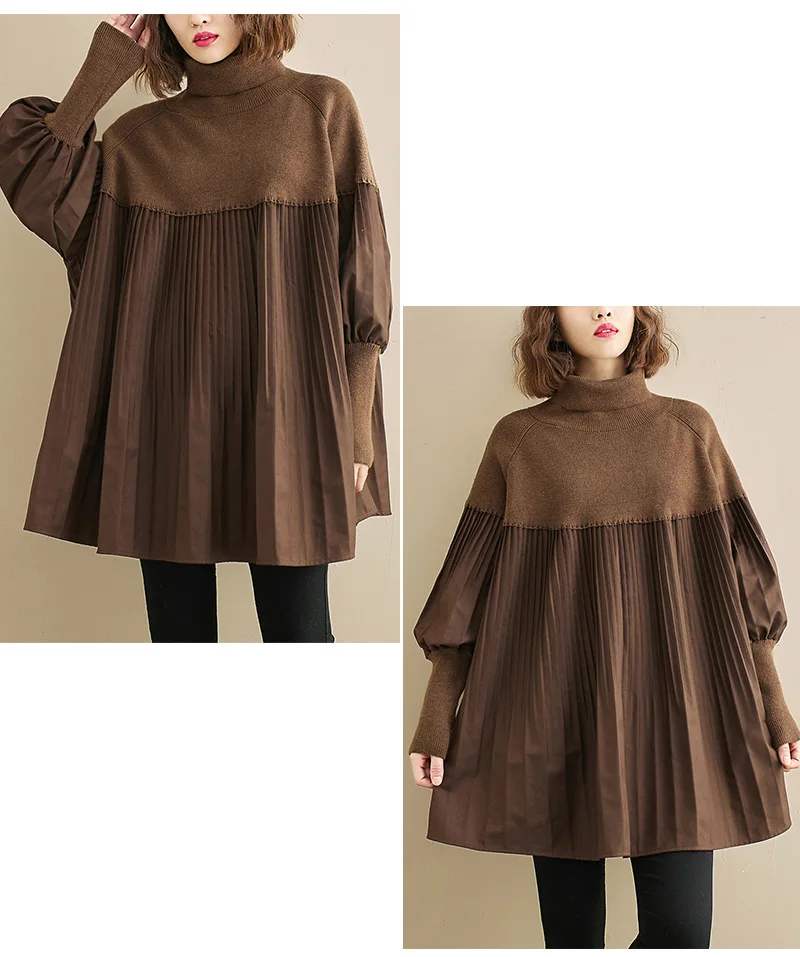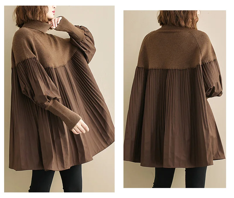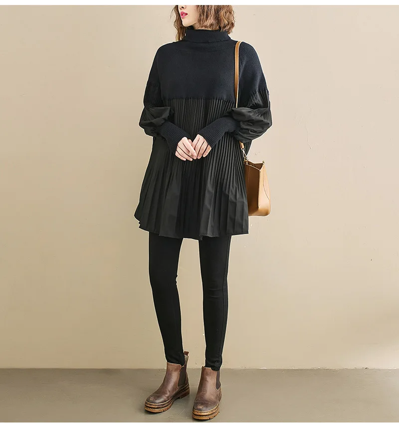 Женский плиссированный вязаный свитер-водолазка, Свободный пуловер с длинным рукавом, большие размеры, зима 2021