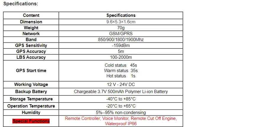 Кроме того, этот гусеничный TK303G является полнофункциональным устройством слежения за транспортными средствами, которое предназначено для широкого спектра приложений слежения за транспортными средствами. Он имеет несколько интерфейсов ввода/вывода, который используется для мониторинга или управления внешними устройствами. Он поддерживается широким спектром аксессуаров, таких как датчик топлива, датчик удара, сирена, пульт дистанционного управления и т. д. встроенный gps-приемник обладает превосходной чувствительностью и быстрым временем для первой фиксации. Его четырехдиапазонная подсистема GPRS/GSM поддерживает 850/900/1800/1900 МГц, что позволяет отслеживать местоположение tk303g в режиме реального времени или периодически отслеживаться с помощью резервного сервера и мобильных устройств. Системная интеграция проста, так как для протокола связи GPRS предоставляется полная документация. Протокол связи GPRS поддерживает широкий спектр сообщений, включая аварийные ситуации, пограничные переезды с гео-забором, низкую батарею и запланированное положение GPS.