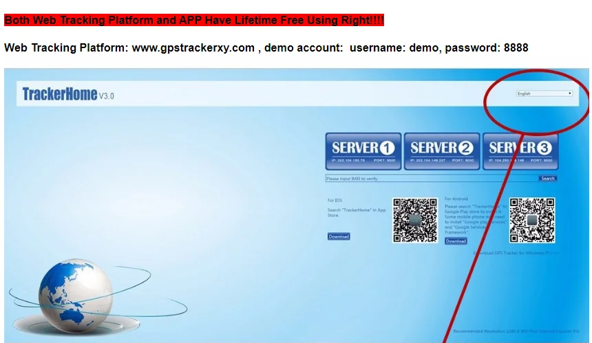 Веб-платформа отслеживания:Www.gpstrackerxy.com, Демонстрационная учетная запись: имя пользователя: демонстрация, пароль: 8888