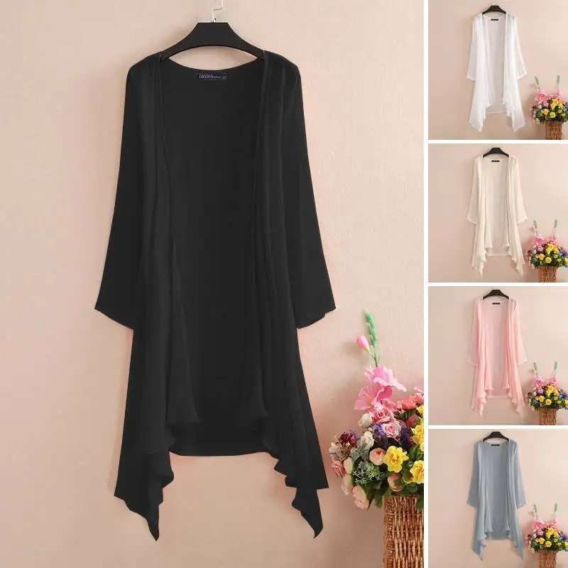 Посылка входит: 1 кардиганМатериал: 35% полиэстер + 65% искусственный шелкЦвета: черный, серый, белый, бежевый, розовыйРазмер: S,M,L,XL,2XL ,,,Длина рукава: полный рукавРисунок: однотонныйДлина: до середины икрыТолщина: тонкаяОсобенности: асимметричный подолСтиль: Досуг, богемный, ретро, Европа, универсальный, литератураСезон: весна, лето, осеньПовод: семья вечерние, пляж, свадьба, праздник, работа, повседневный