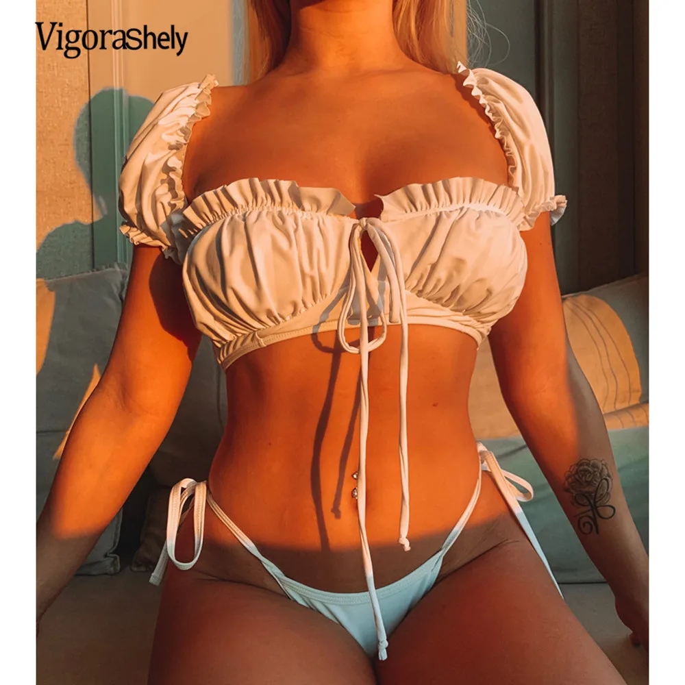 Новинка 2020, пикантный белый комплект бикини Vigorshely с рюшами, купальник, женский купальник пуш-ап, Женский Бразильский купальный костюм бикини на завязках