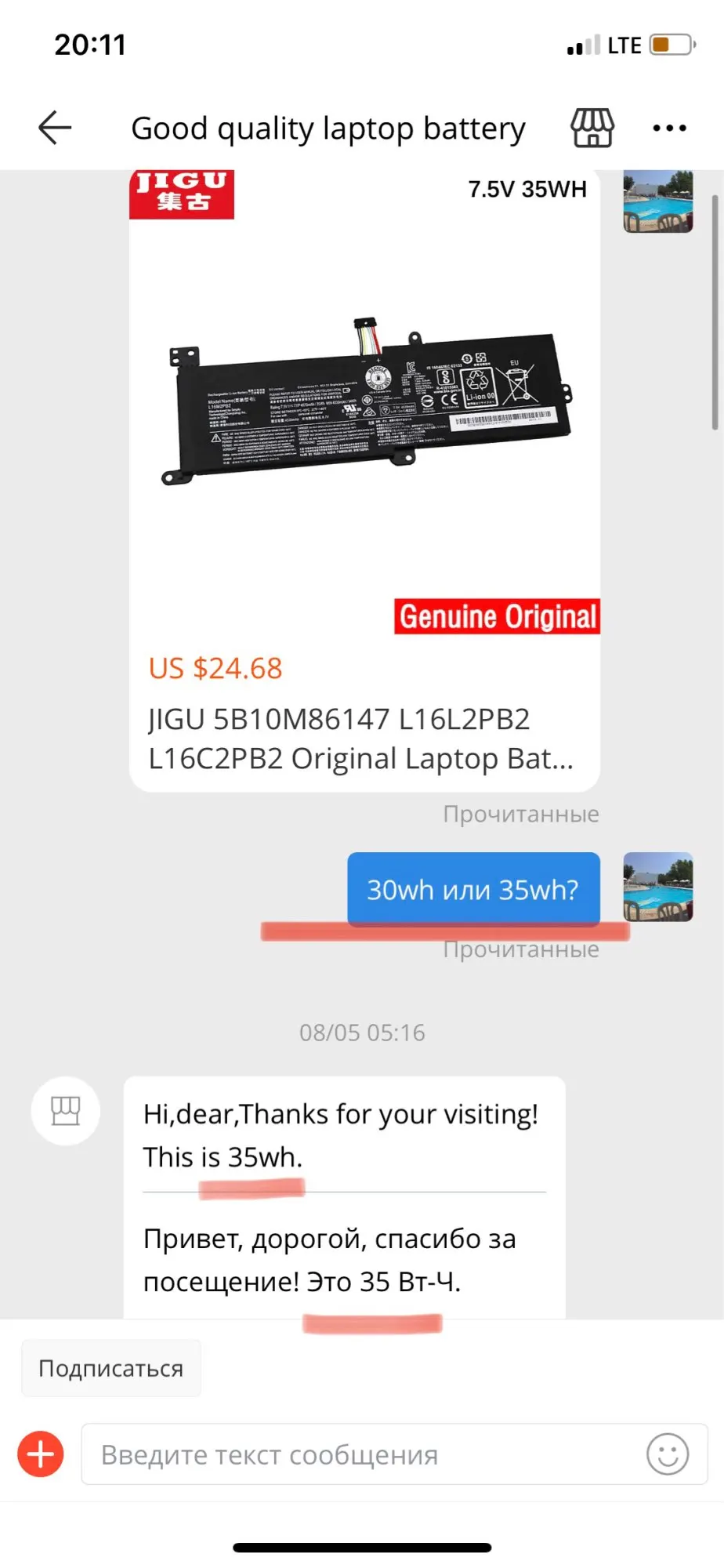 Будьте внимательны! По факту 30wh! перед тем как заказать батарею уточнил у продавца, точно ли она на 35wh? На что он ответил Да. Это было очень важно! Заказал, доехала довольны быстро, хоть в этом плюс, до Мск ровно месяц, забирал в СДЭКе. Далее плюсы заканчиваются, после распаковки и снятия наклеек которые скрывают модель и характеристики батарее, обнаружил что она на 30wh, написал продавцу, молчал 2 дня потом ответил, что ой извините действительно так, это ошибка на странице товара, мы срочно это поменяем, (как видите меняет уже две недели), далее слушать не стал, открыл спор, продавец хотел что бы я ее выслал обратно, не считаю это нормальным гонять батарею месяц туда, месяц обратно и просто ждать свои деньги обратно, уверен продавец умышленно вводит людей в заблуждение!