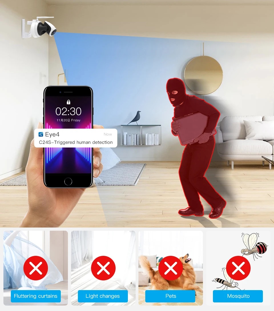 √ Модернизированный датчик сигнализации, камера сигнализирует только обнаружение движений человека.√ Вам не придется беспокоиться о сигналах тревоги от питомцев, летающих комаров, порхающих занавесок и так далее.√ По сравнению с нормальным распознаванием, эта камера с искусственным интеллектом может эффективно снизить сигнал тревоги