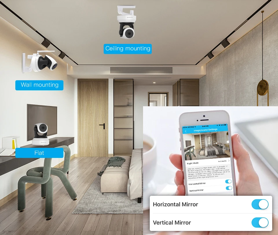 · Укладывается ровно, переворачивается на потолок, сбоку крепится на стену.· Соответствует различным требованиям к установке.· Не беспокойтесь о проблемах с перевернутой перспективой при установке камеры и потолка, ее можно изменить на нормальное зрение через приложение Eye4,