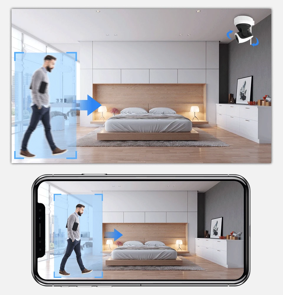 Когда камера обнаруживает человека, она кадрирует человека в видео, и камера автоматически вращается для отслеживания движения человека.