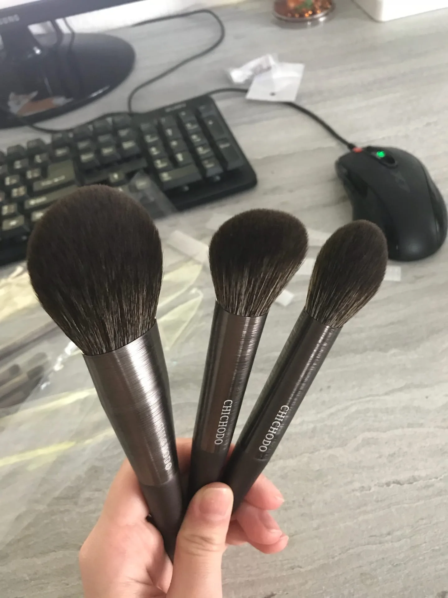 Это просто очень качественные, плотно набитые кисти. Стоят своих денег однозначно. Кисти большого размера реально большие. Очень мягкие , кайфую когда в руках держу. Ворс, как натуральный. Доставка с момента заказа составила 16 дней в УР.