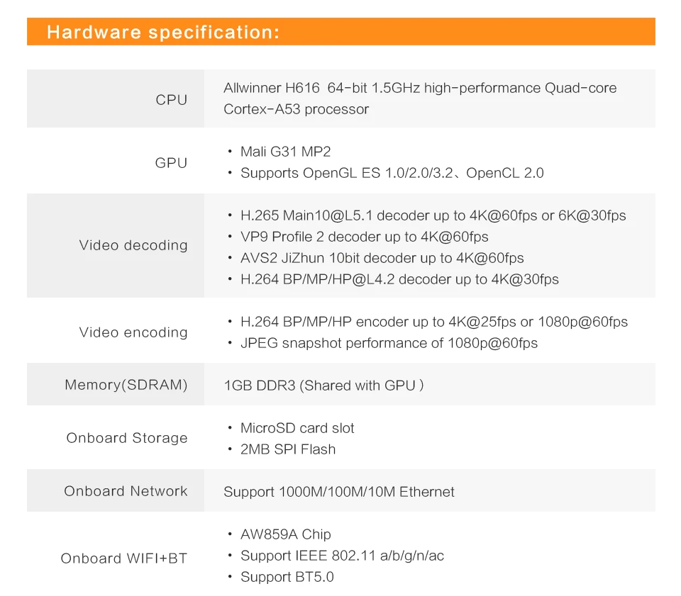 Все еще тестирование, но это может быть хорошим, маленьким и мощным sbc, если Поддержка программного обеспечения будет расширена. На самом деле он предоставляется только производителем. Пробовал их Debian Buster (серверное изображение) с их лоскутным ядром v.4.9 и U-boot 2018 (более поздние версии): он стабильный, но мне нужно было рекомпилировать ядро, удаляя 3 строк кода (в sdio_v3.c, но в menuconfig, в противном случае, когда вы запускаете сборку. sh он обновит местные источники с GitHub repo) Для беззвучных раздражающих уведомлений от nosense. Я рекомендую Orange Pi внести свой вклад в ядро основной линии, если они хотят, чтобы люди широко узнавали и использовали (после покупки $) свои продукты.