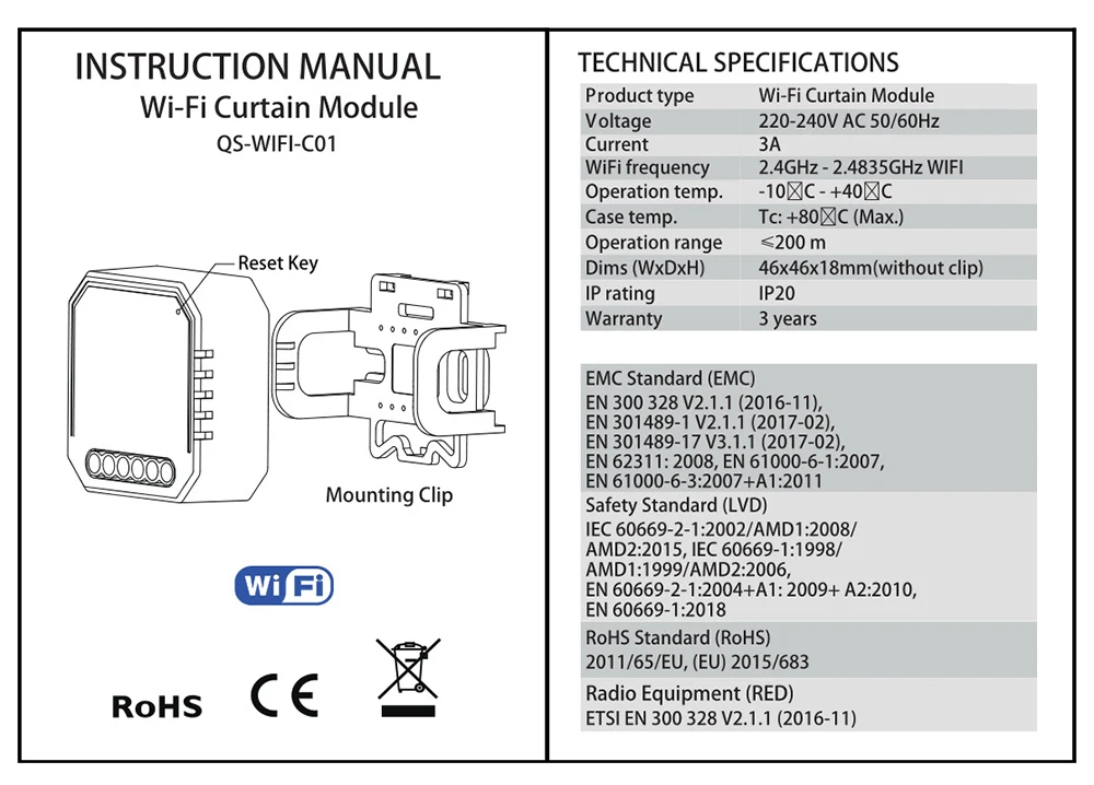 Умные модули переключателей zigbee соответствуют европейскому качеству и безопасным стандартам, одобрены CE и RoHs, проверены intertek lab.Стандарт EMC (EMC)EN 300 328 V2.1.1 (2016-11),EN 301489-1 V2.1.1 (2017-02),EN 301489-17 V3.1.1 (2017-02),EN 62311: 2008, EN 55015:20 13 + A1:2015, EN 61547:2009EN 61000-6-1:2007EN 61000-6-3:2007 + A1:2011Стандарт безопасности (LVD)IEC 60669-2-1:2002/AMD1:2008/AMD2:2015, IEC 60669-1:1998/AMD1:1999/AMD2:2006,EN 60669-2-1:2004 + A1: 2009 + A2:2010,EN 60669-1:2018Стандарт RoHS (RoHS)2011/65/EU, (EU) 2015/863Радиооборудование (красный)ETSI EN 300 328 V2.1.1 (2016-11)Чип; ESP 8266