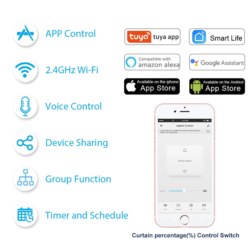 После установки этого модуля ваш настенный ручной переключатель все еще работает, он может открывать, приостанавливать или закрывать затвор, а также становится умным.1. Мобильный телефон пульт дистанционного управления открытым или закрытым2. Вы можете установить расписание времени открытия или закрытия окна или рольставни3. Голосовое управление с помощью Google Home, Alexa , Echo
