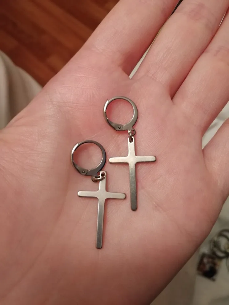 маленькие крестики,аккуратные,серьги закручиваются,что не очень удобно,а так отлично смотрится