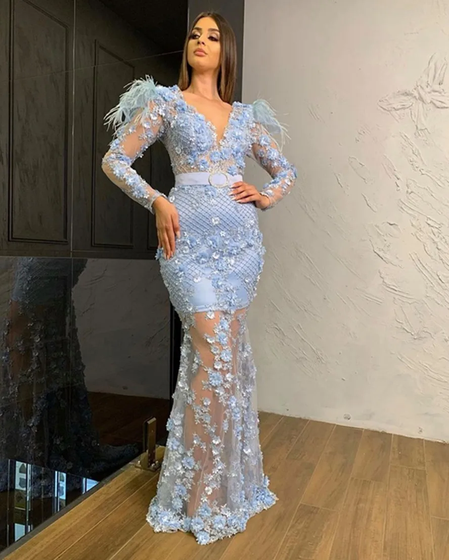 Милые носочки для малышей, синий 3D цветок платья для выпускного вечера 2021, украшенная жемчугом и кружевом; Модель в стиле перо Длинные пикантные вечерние платья для выпускного увидеть через официальная Вечеринка платье
