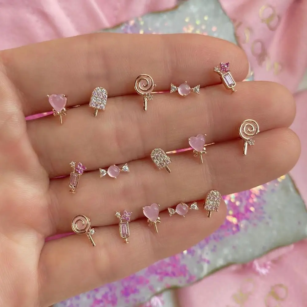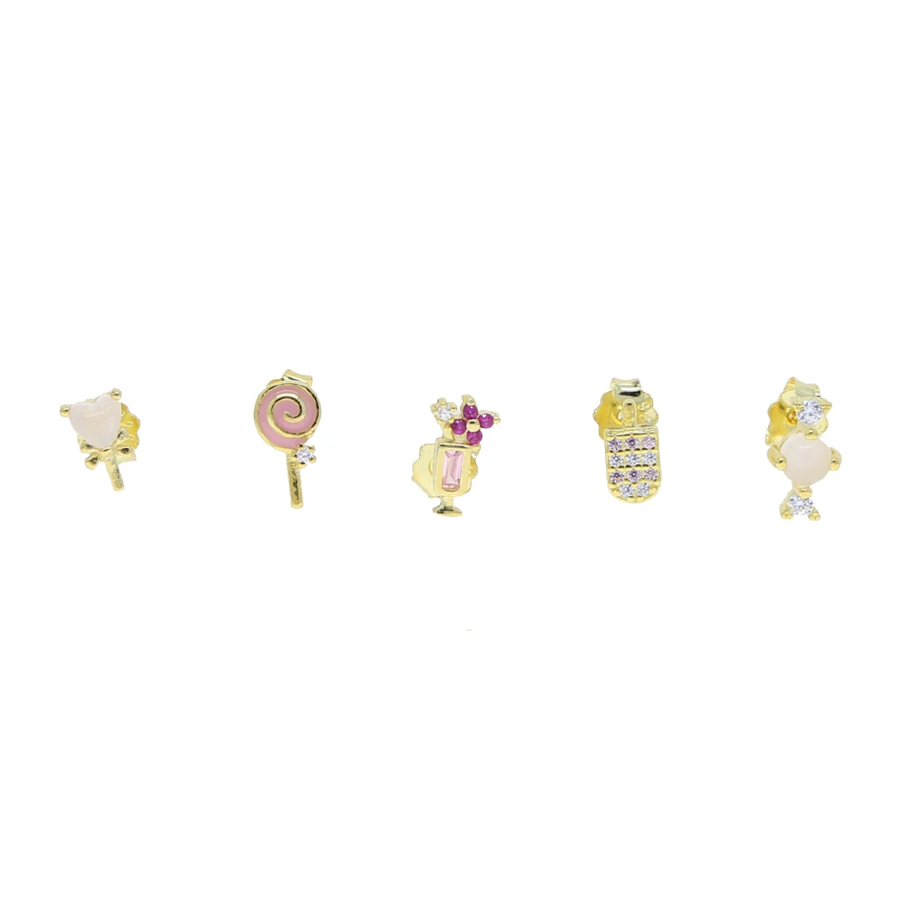 Милые милые гвоздики для девочек розового и золотистого цветов с розовым камнем, конфетные конфеты, мороженое, сок, маленький Маленький комплект из 5 предметов, 925 пробы, серебряная изящная серьга