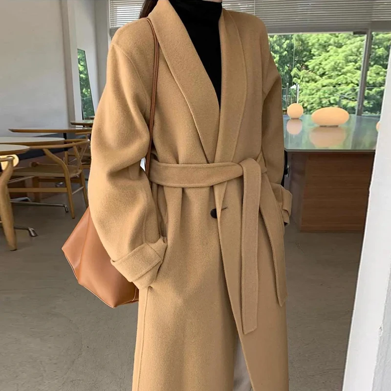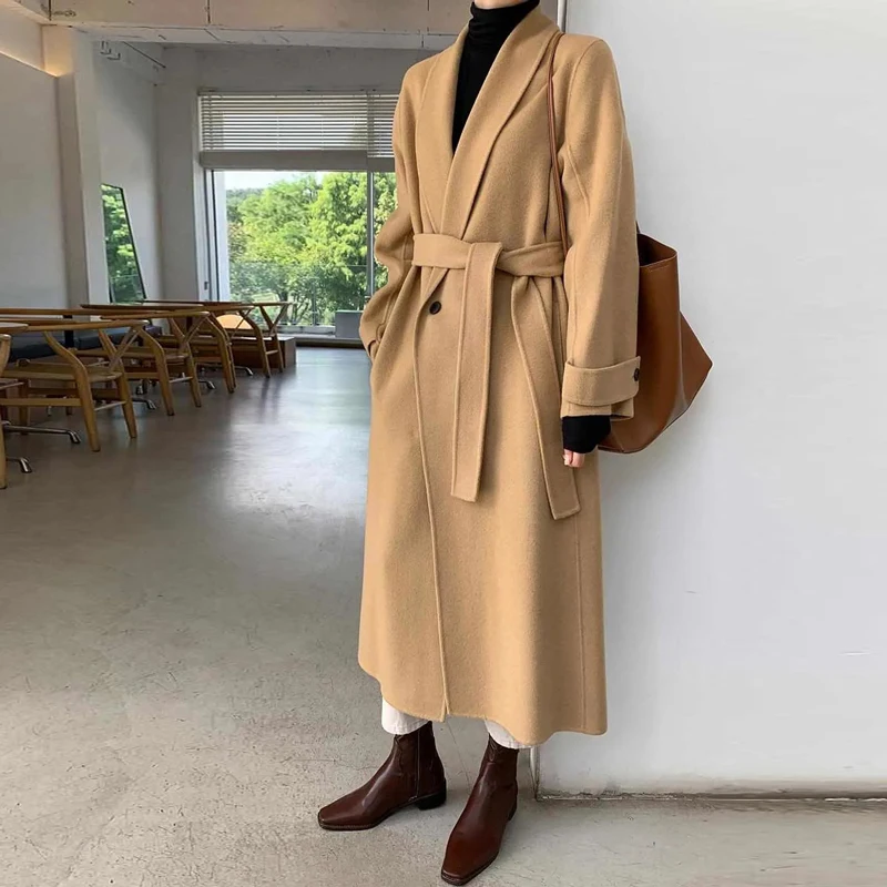 Пальто женское Шерстяное с поясом, однотонное двубортное плотное теплая уличная одежда с поясом, Офисная уличная одежда в Корейском стиле, зима