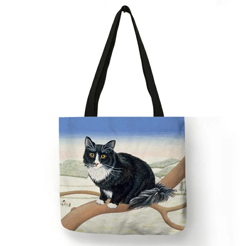 Сумка-тоут женская, из льна, с принтом в виде кошки